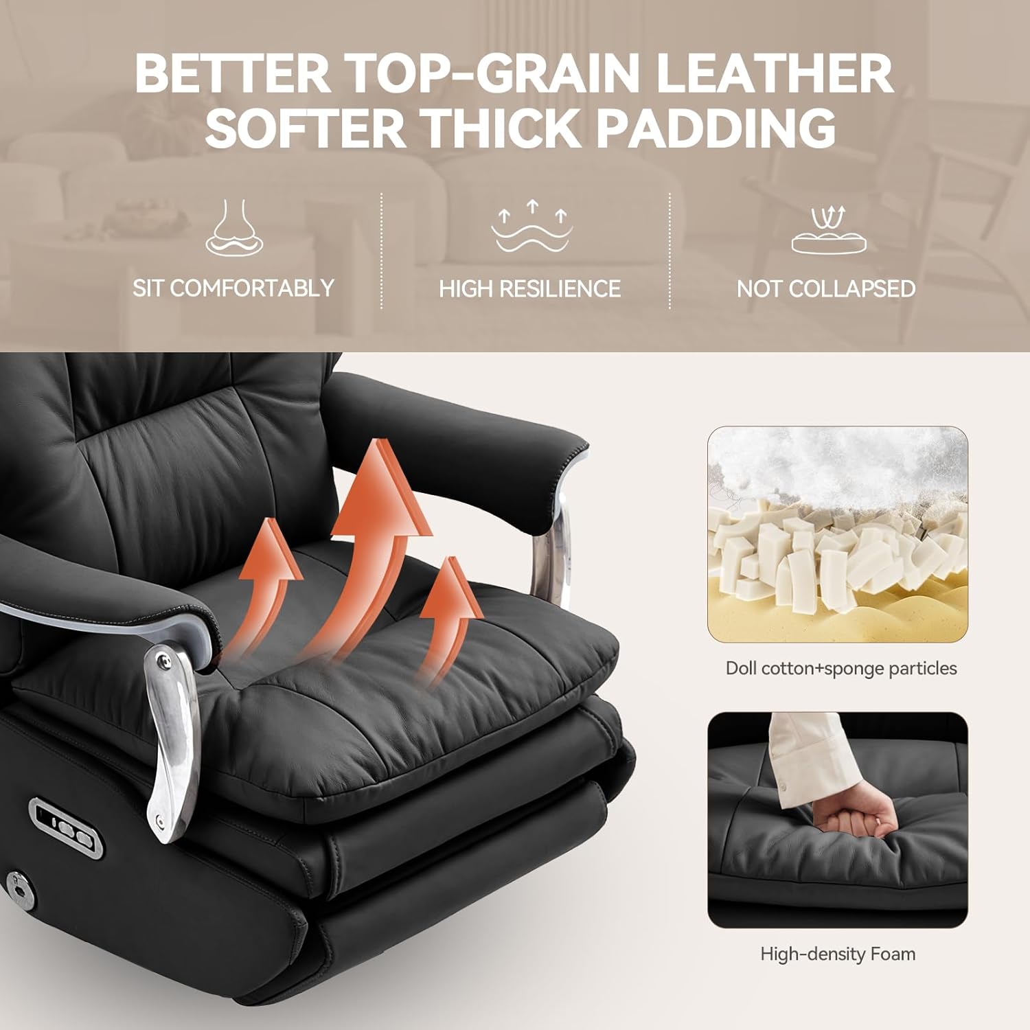 - Genuine Leather & Ergonomic Support: Crafted from breathable, skin-friendly and easy-to-clean genuine leather, this ergonomic office chair is built to offer both durability and comfort. With thick and soft seat cushion padding, wide armrests, and ergonomically curved backrest design, this office chair recliner is designed for extended use, providing exceptional back and lumbar support. A perfect choice for those who appreciate a luxury office chair. (Note: Only the contact surface is genuine leather)