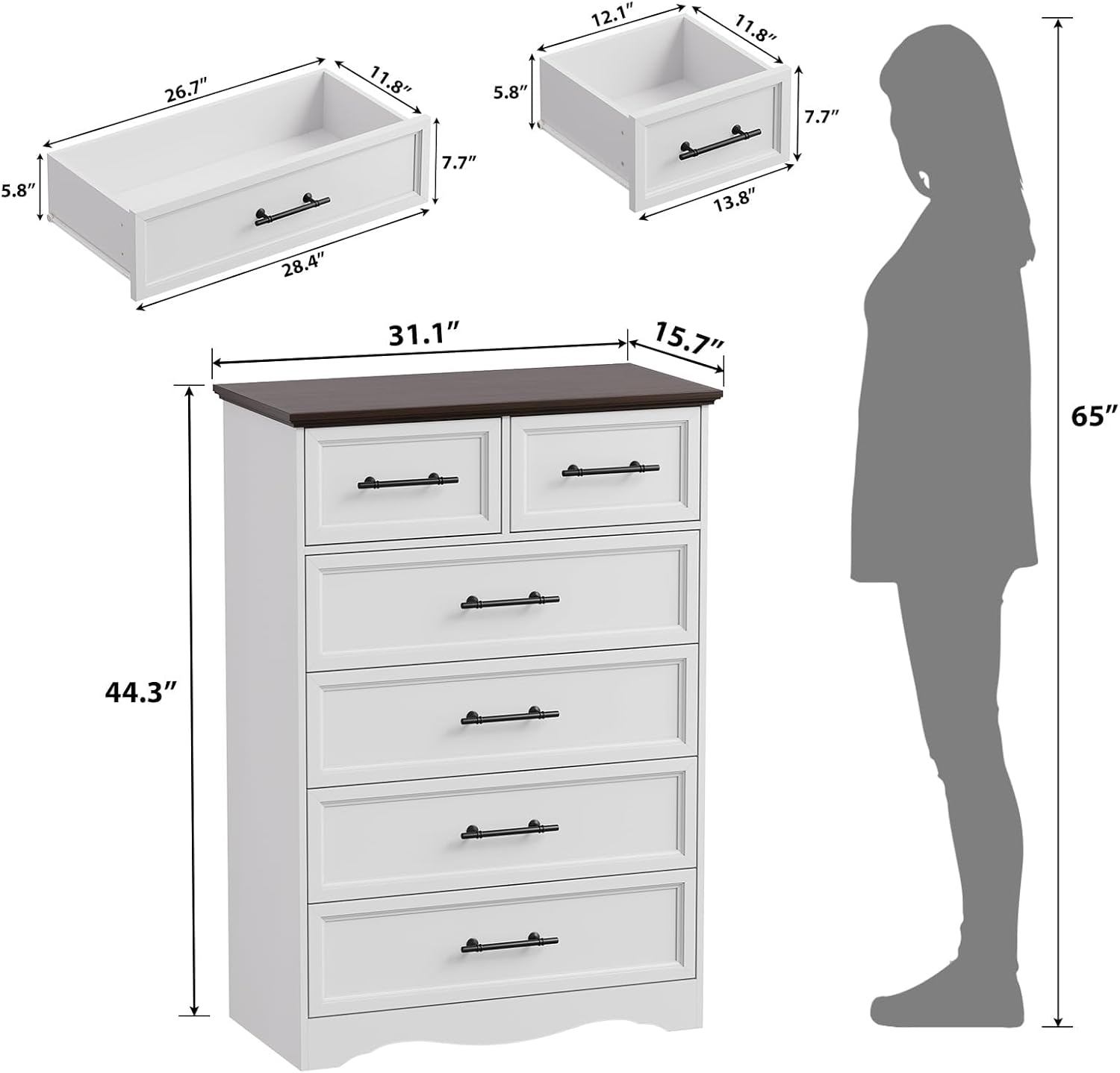 - 【Dimensions】The 6 drawers dresser dimension: 15.7"D x 31.08"W x 44.3"H. Whether in a modern loft or farmhouse setting, this chest of drawers fits right in. It presents a sophisticated interpretation of rustic charm, featuring subtle replicated wood grain with a natural finish for an authentic feel.