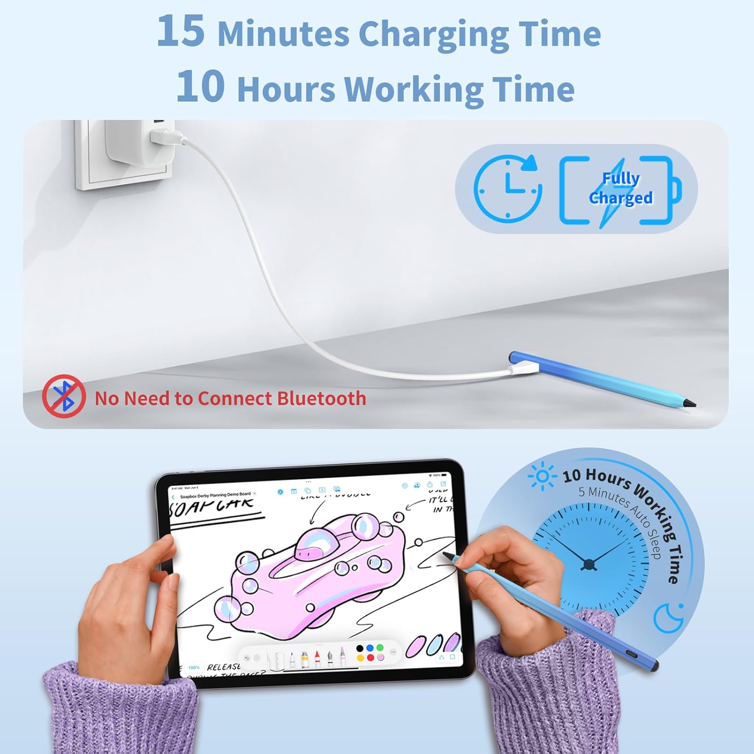 - ✅Fast Charging and Long Standby: This stylus pen support 10 hours of continuous use and 180 days long term standby for only 15 Minutes per charging. Don’t need to turn off it by hand, it will auto-fall asleep after idle for 5 minutes to save power
