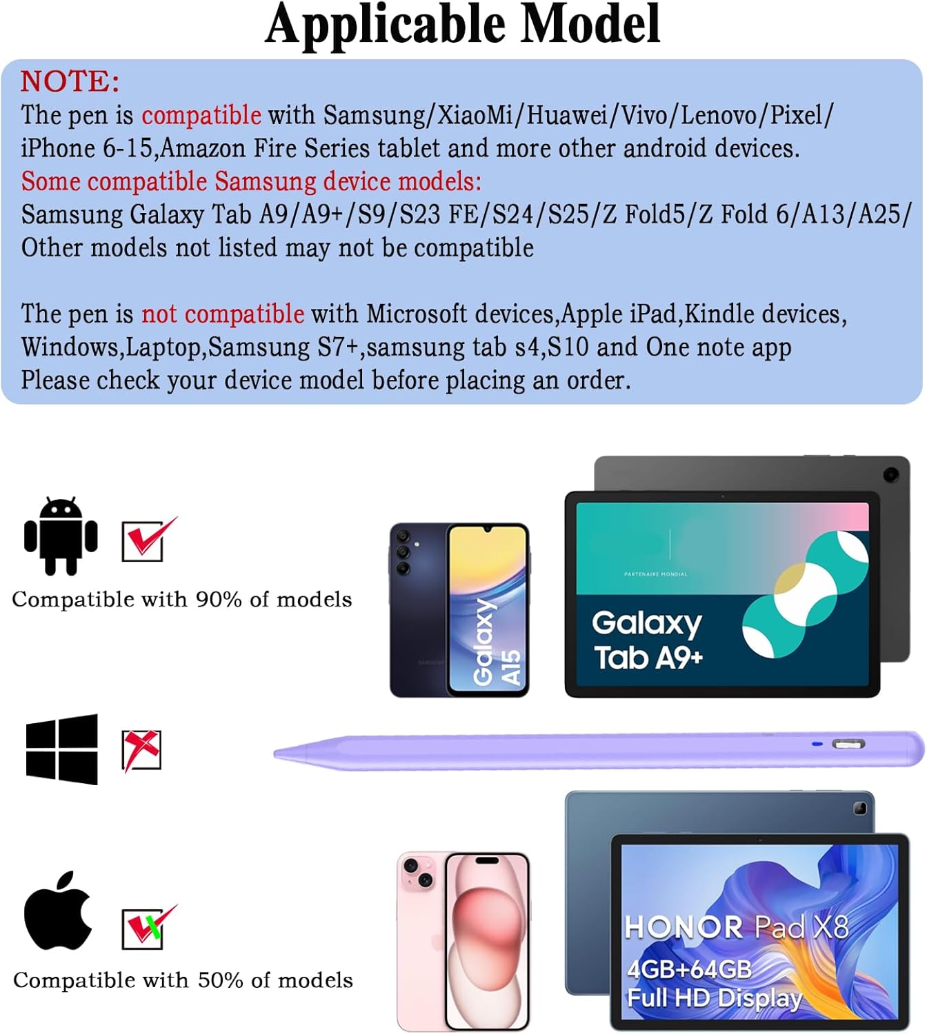 - ăWide Compatibilityă-This stylus pen for touchscreen is universal for capacitive screen electronic products and is specially designed for Android device on the market.The iphone stylus pen is suit with Samsung/XiaoMi/Huawei/Vivo/Lenovo/Pixel/iPhone 6-15 ,Amazon Fire Series tablet and more other android devices. Some compatible Samsung device models-Samsung Galaxy Tab A9/A9+/S9/S23 FE/S24/S25/Z Fold5/Z Fold 6/A13 /A25/ (Note: This lenovo pen is not compatible with Microsoft devices,Apple iPad,Kindle devices,Windows,Laptop,Samsung S7+,samsung tab s4,S10 and One note app. Please check your device model before placing an order.