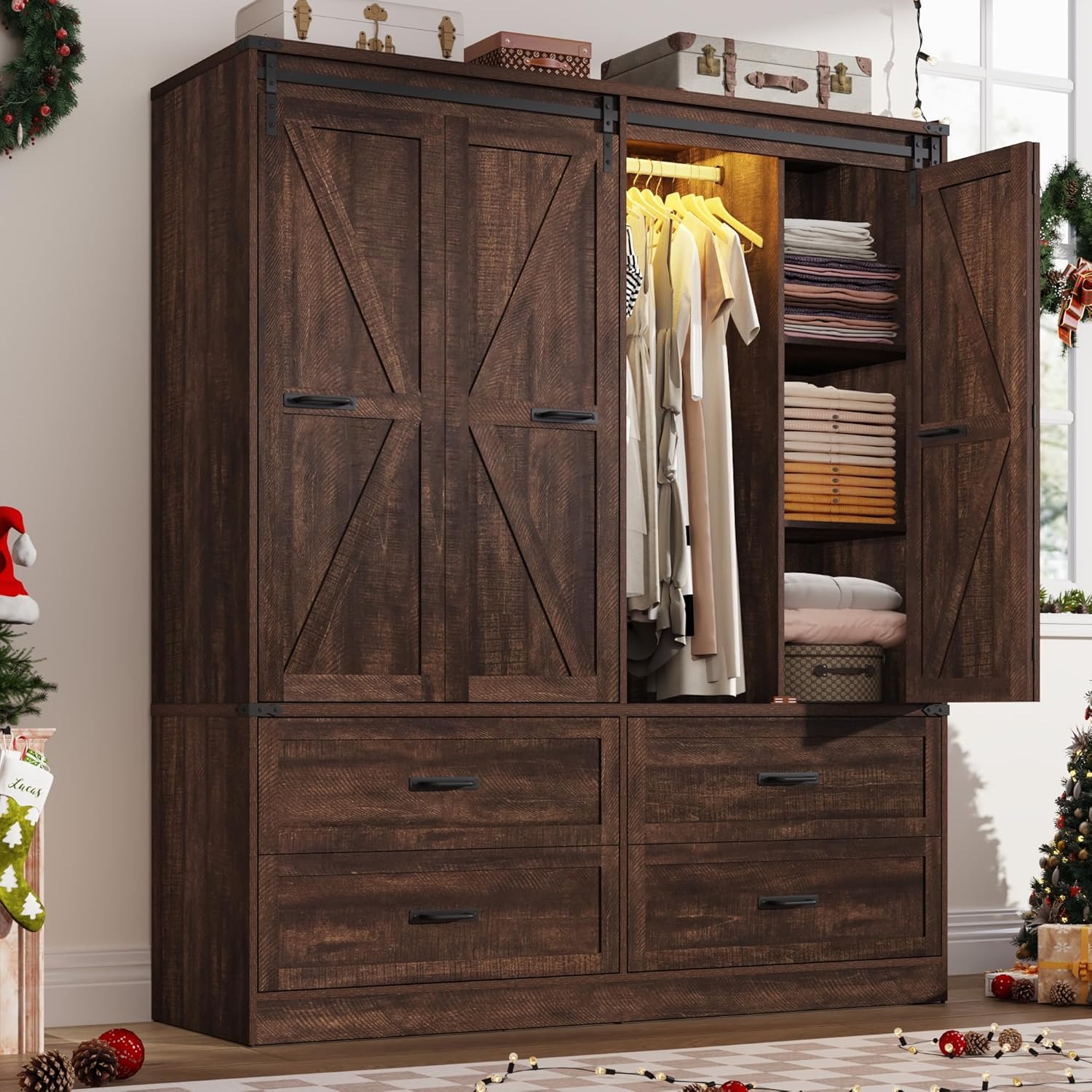 Farmhouse 4 Doors Armoire Wardrobe Closet w/Folding Sliding Barn Door and Lights, LED Armoire Closet w/Drawers for Bedroom, Freestanding Wooden Wardrobe Storage Closets w/Hanging Rod,Rustic Brown