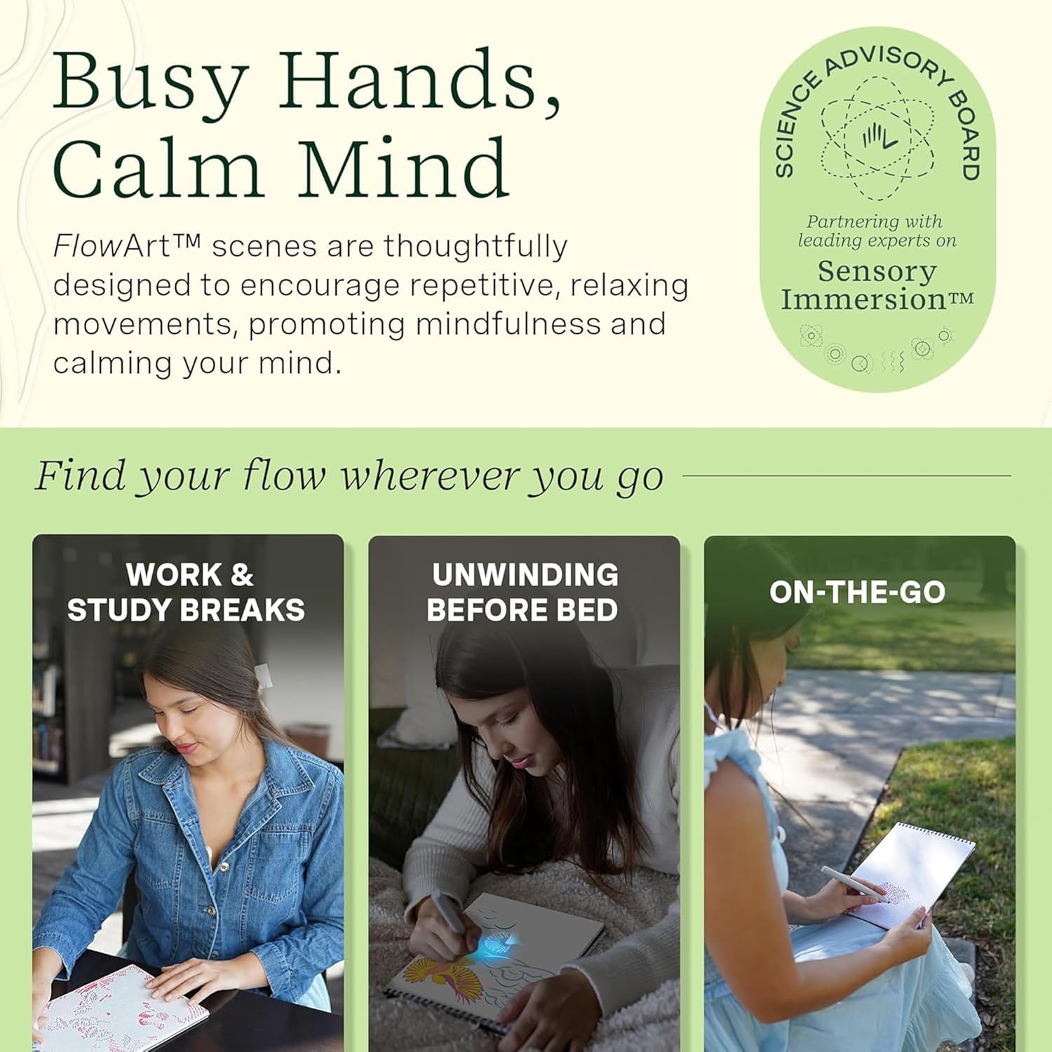 - Find Your Flow Wherever You Go: Busy your hands and calm your mind with portable activity pads, each with 20 meditative scenes designed to get you into a blissful flow state. Great for work and study breaks, unwinding before bed, or well-being on-the-go.