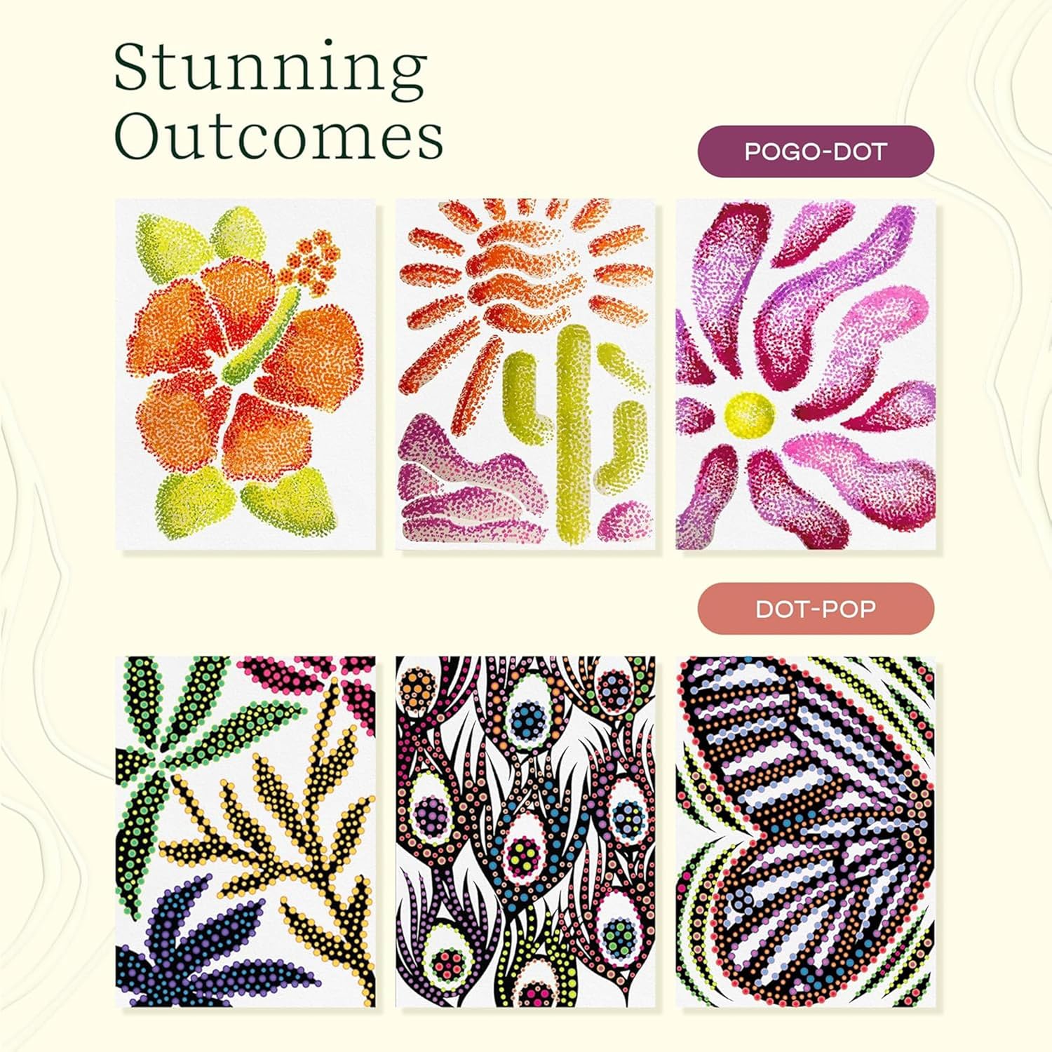 - Dot-Pop, Natural Flow: Use the special dot markers to fill in the empty spaces with dots to create an amazingly colorful scene. Then, use the white marker with color-changing ink to transform dots into new colors!