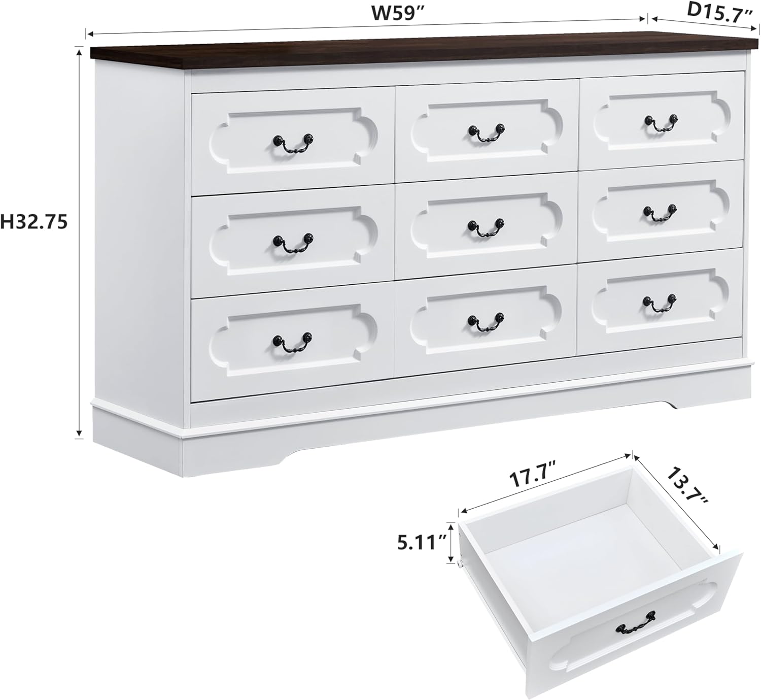- 9 Drawers Bedroom Dresser- Dimensions: 59"(W) x32.75"(H) x 15.7"(D). Wide tall dressers for bedroom features 9 spacious wooden large drawers (Size: 17.7''W x 13.7''D x 5.11''H) which provides ample storage space for your bedroom, kidsroom, guest room, closet, hallway or living room, keeping your clothes and essentials organized and easily accessible