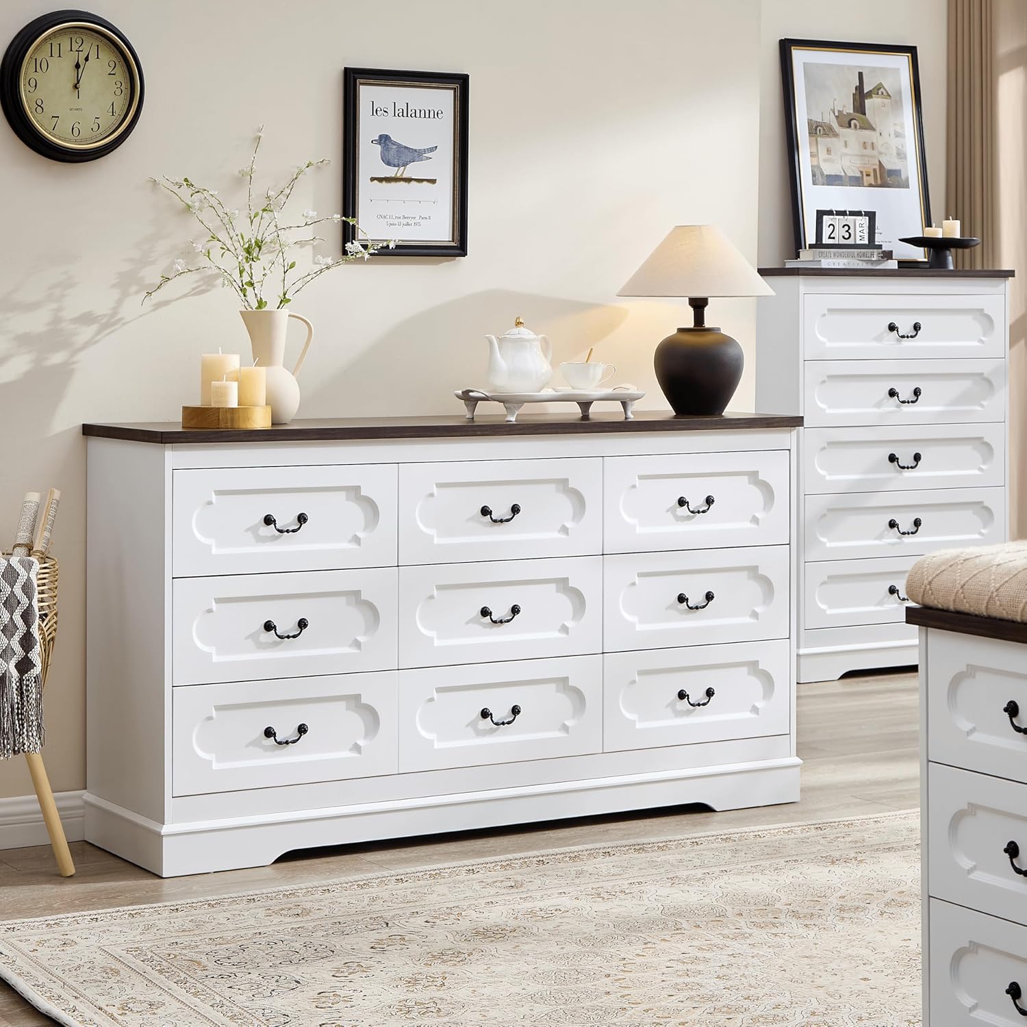 - Wood Wide Dresser-The white dresser for bedroom is crafted from premium-grade engineered wood. This bedroom dresser features a reinforced foundation delivering lasting durability. Drawers are equipped with high-quality metal slide rails, which are easy to pull in and out. For secure and private storage, the back panel is designed to enhance stability. We've also included an anti-tip kit for added family safety