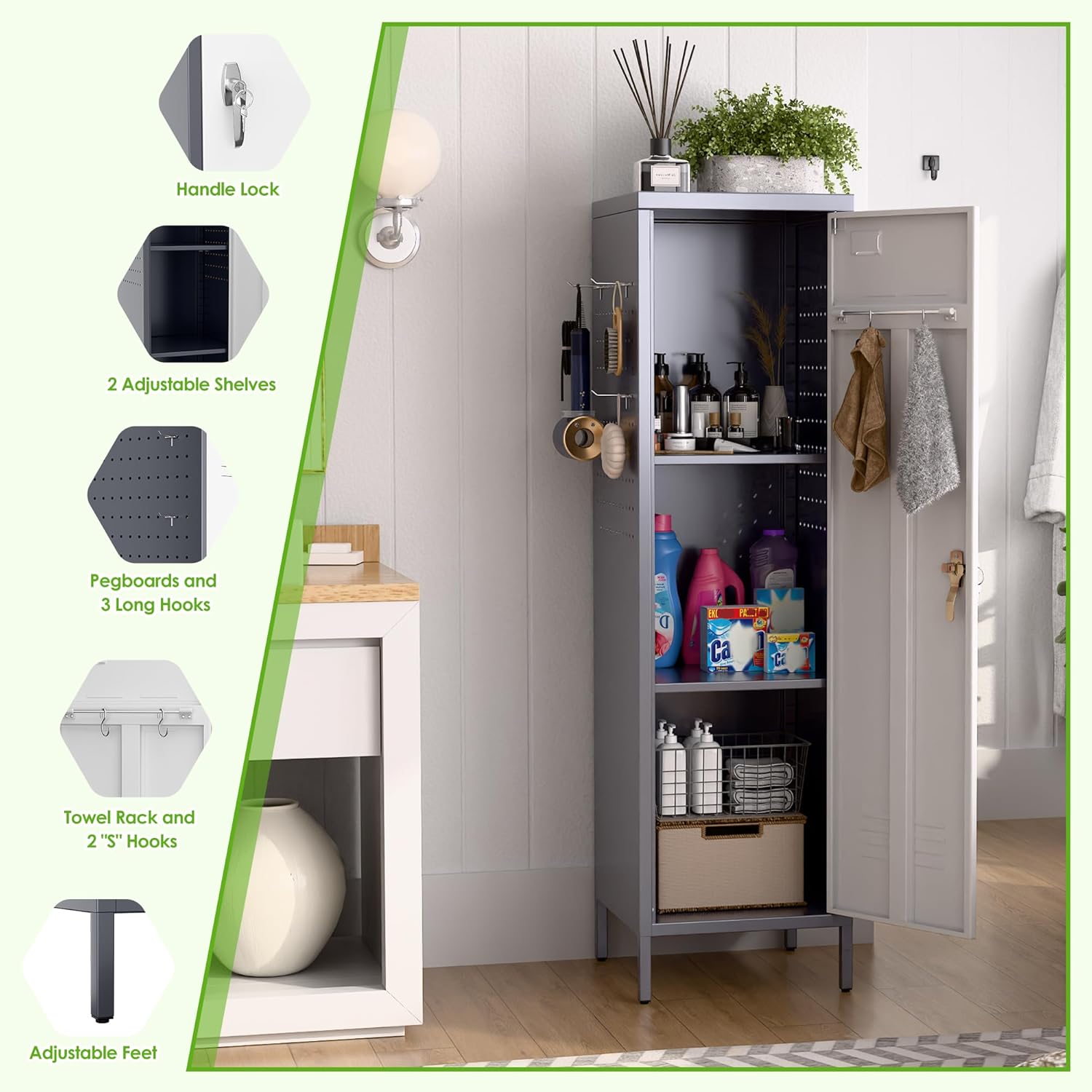 Aobabo Metal 54" H Metal Storage Locker for Employees, Lockable 1 Door with Towel Rack and 2 Side Pegboards with Hooks for Home School Office Gym, Assembly Required (Gray White)