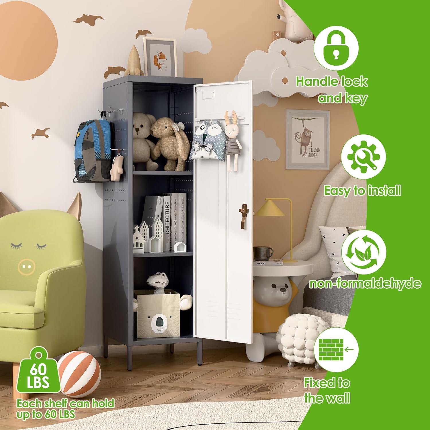 - 【Multifunctional-use】Metal storage locker door has a towel rack with two S-hooks for hanging towels.The Pegboards on both sides of the locker have three long hooks that can be used to hang clothes