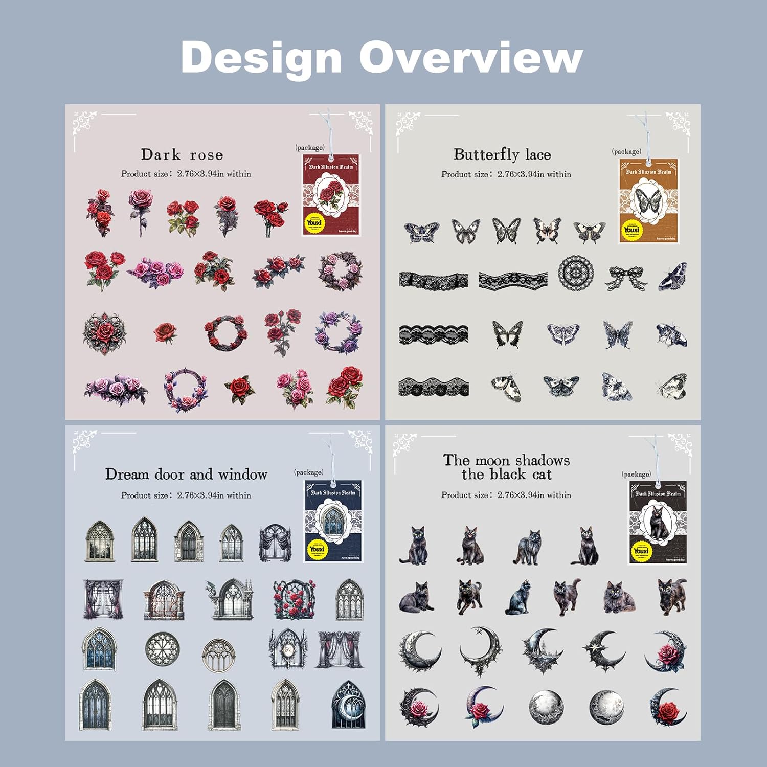 - Mysterious Gothic-Themed Designs: This dark fantasy sticker set includes 80 pieces with 4 unique styles, each featuring 20 different gothic-themed designs. From enchanted black cats and moonlit castles to blood-red roses and intricate lace patterns, these stickers bring a vintage and mystical atmosphere to your scrapbook and journal projects