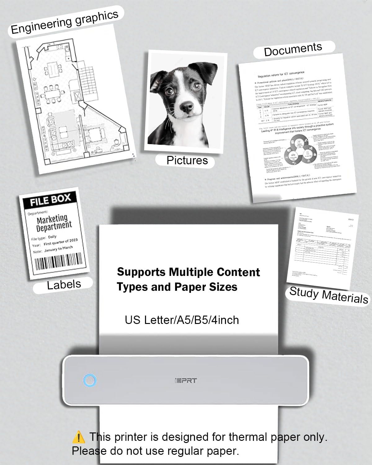 - Gift Worthy Printer for Work or Studyļ¼This compact thermal printer supports US Letter/ A4/ A5/ B5 / 4-inch paper sizes. Print PDFs, notes, receipts, and reports on demand. Ideal for students, digital nomads, field professionals, or anyone needing portable printingāmakes a practical and thoughtful gift too.