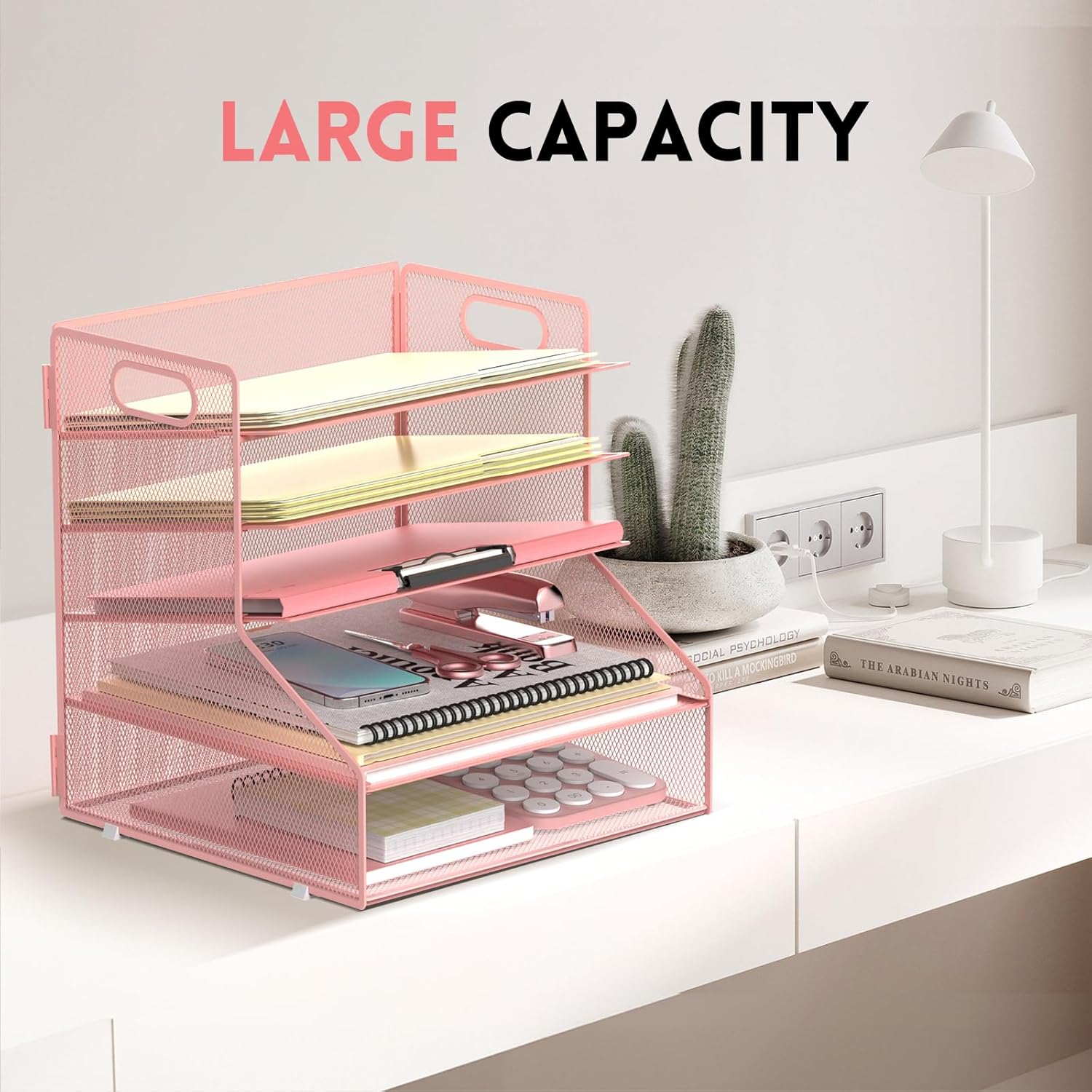 SUPEASY 5-Tier Desk File Organizer, Metal Letter Paper Tray, Desk Organizers and Accessories for Home Office Supplies, Pink