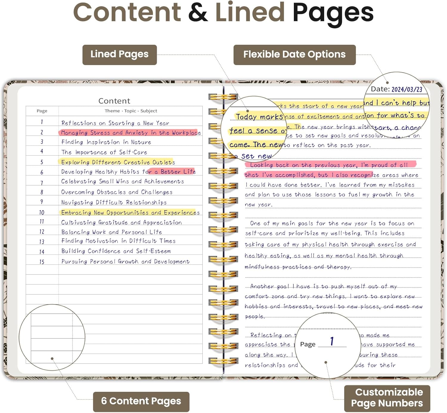 - Structured College-Ruled Pages: Featuring 7mm college-ruled lines, this journal notebook helps keep your writing organized and legible. The evenly spaced lines are perfect for structured notes, work lists, or detailed writing, making it an excellent choice for school students, professionals, and writers alike. It also includes 6 content pages, perfect for creating an index for easy reference.