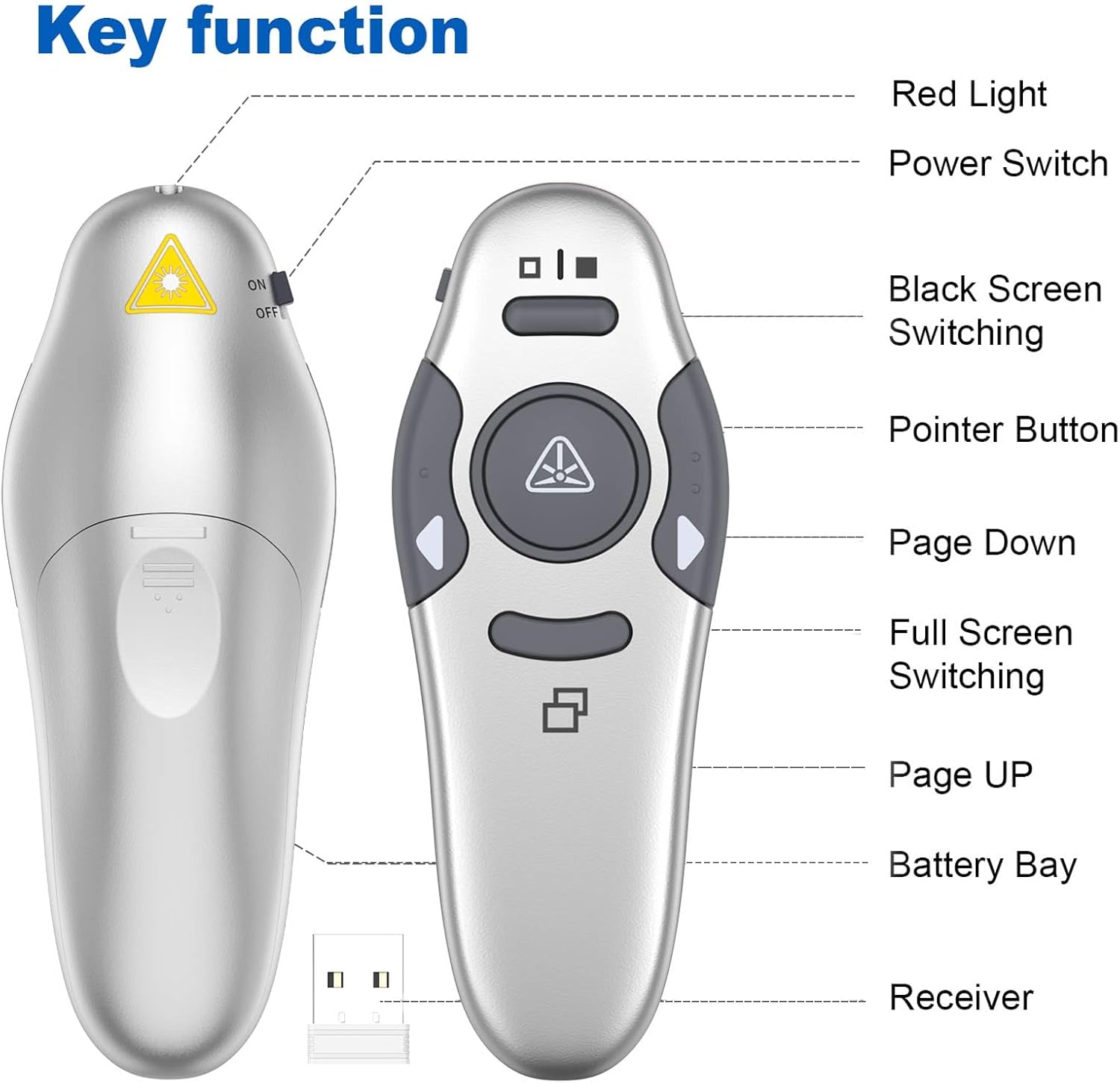 - Red Light Pointer for Clarity: Featuring a built-in red light pointer that stands out on most backgrounds, this presentation clicker helps you highlight key points in your presentation. The clicker for powerpoint presentations has standard buttons like page up/down, black/full screen switching, etc. With the light button held on, the remote works well reliably and effectively. The power switch to turn off after use helps extends battery life
