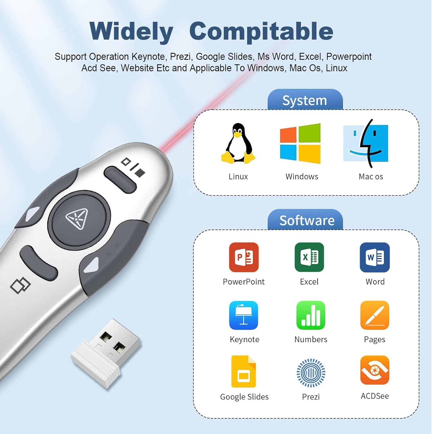 - Broad Compatibility: Compatible with Windows 2003/XP/Vista/7/8/10 and above, macOS, Linux, and Android, this slide clicker supports popular software like PowerPoint, Excel, Prezi, Google Slides, and iWork (Keynote, Numbers, Pages). The presentation clicker is a versatile tool for most presentation need