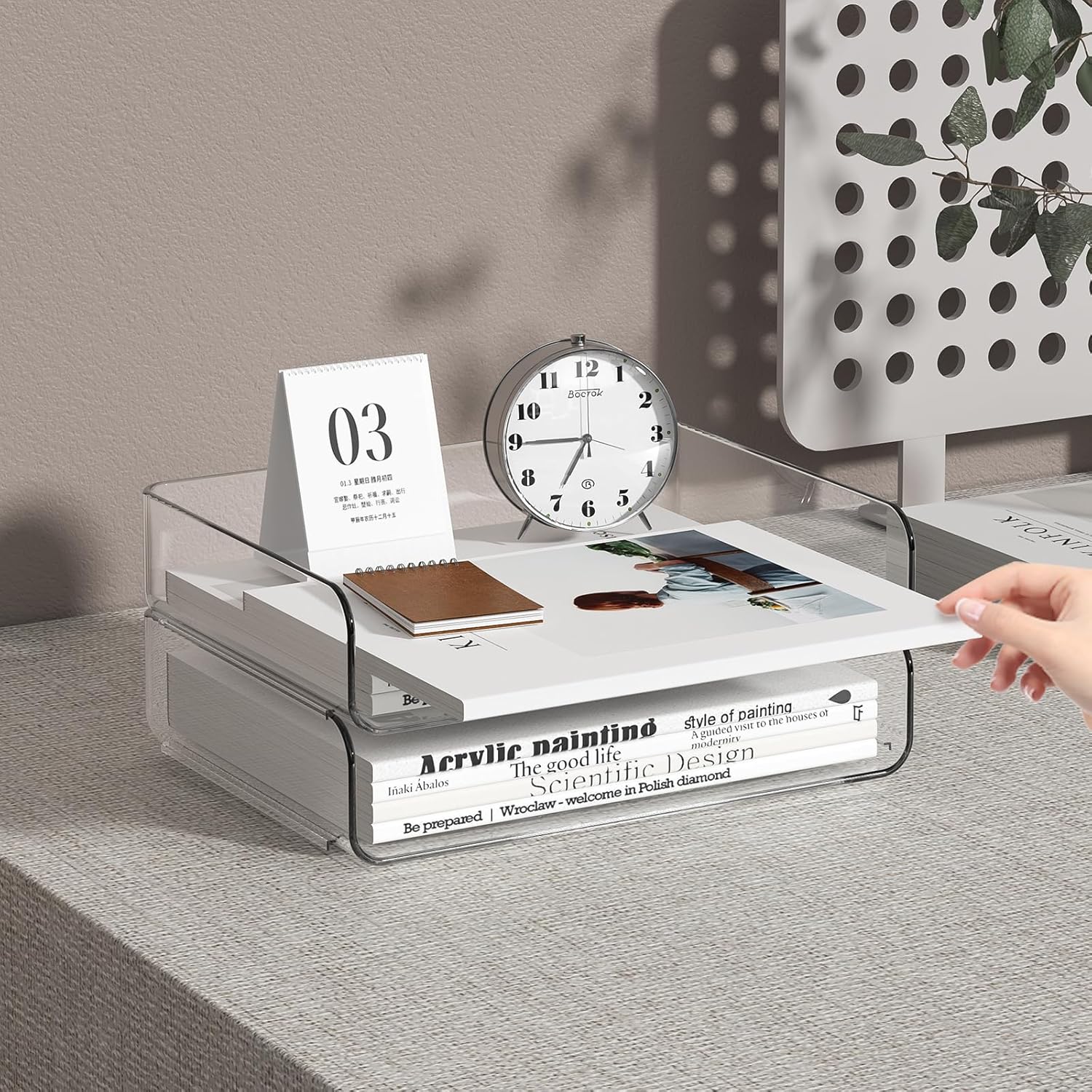 2-Tier Acrylic Paper Tray Organizer-Low-ProfileDesk File Sorter for Office/Home, Clear Stackable LetterTray for Bills, Crafts, Notebooks