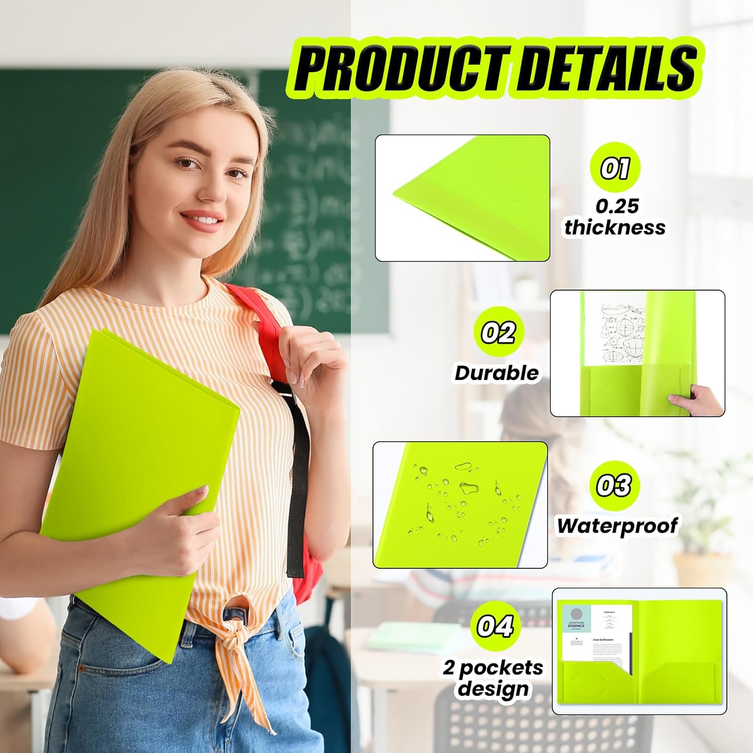 - Enough Quantity to Use and Replace: you will receive 24 pieces fluorescent green plastic folders, each is designed with 2 pockets, fitting 8.5 x 11 inch letter size paper; Each pocket can stack 50 pages of letter size paper easily and neatly
