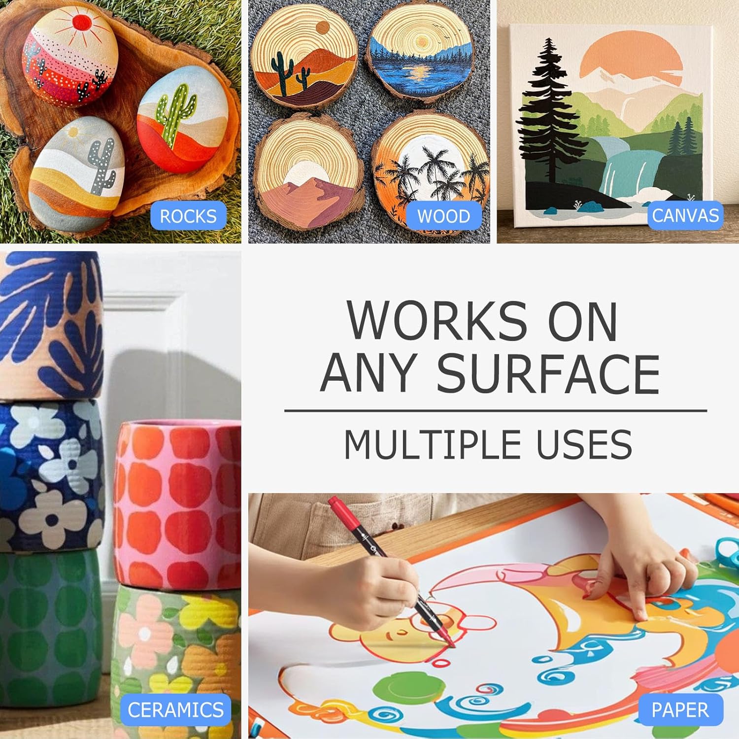 - Dual Tip Acrylic Markers: Each paint pen come with a brush tip and a round dot tip. With the unique and convenient dual tip design, these paint markers can meet various needs. Suitable for both beginners and professionals to use at home, office, school or outdoors