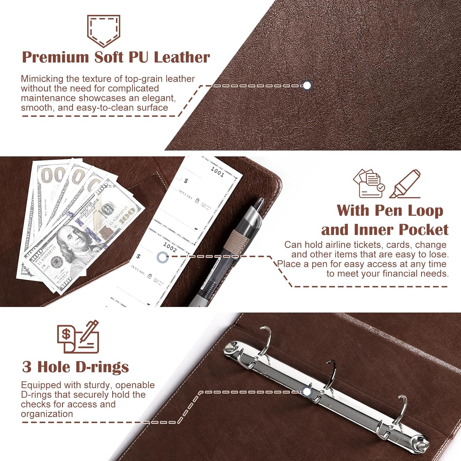 - Versatile Openable Check Organizer:PU leather 3-ring check binder is specifically designed for professionals in the workplace, compatible with both 3-hole and 9-hole checks, meeting diverse office needs. The extended edge design of the cover protects the edges of the check pages, ensuring information security. The business check binder interior features a sturdy, openable D-ring design that not only securely holds the checks but also facilitates easy access, categorization, and organization, enhancing work efficiency.This Binder is designed for COMPACT (smaller size) Checks, not for standard size. Please measure your checks and make sure it fits your checks before ordering!