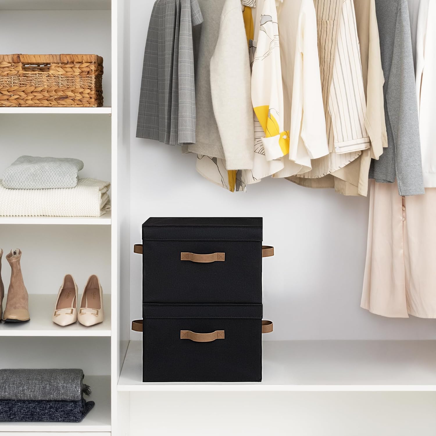 StorageWorks Fabric Storage Bins with Lid, Decorative Storage Boxes for Shelves, Stackable Closet Organizer Basket with Handles, Large, Black, 2-Pack