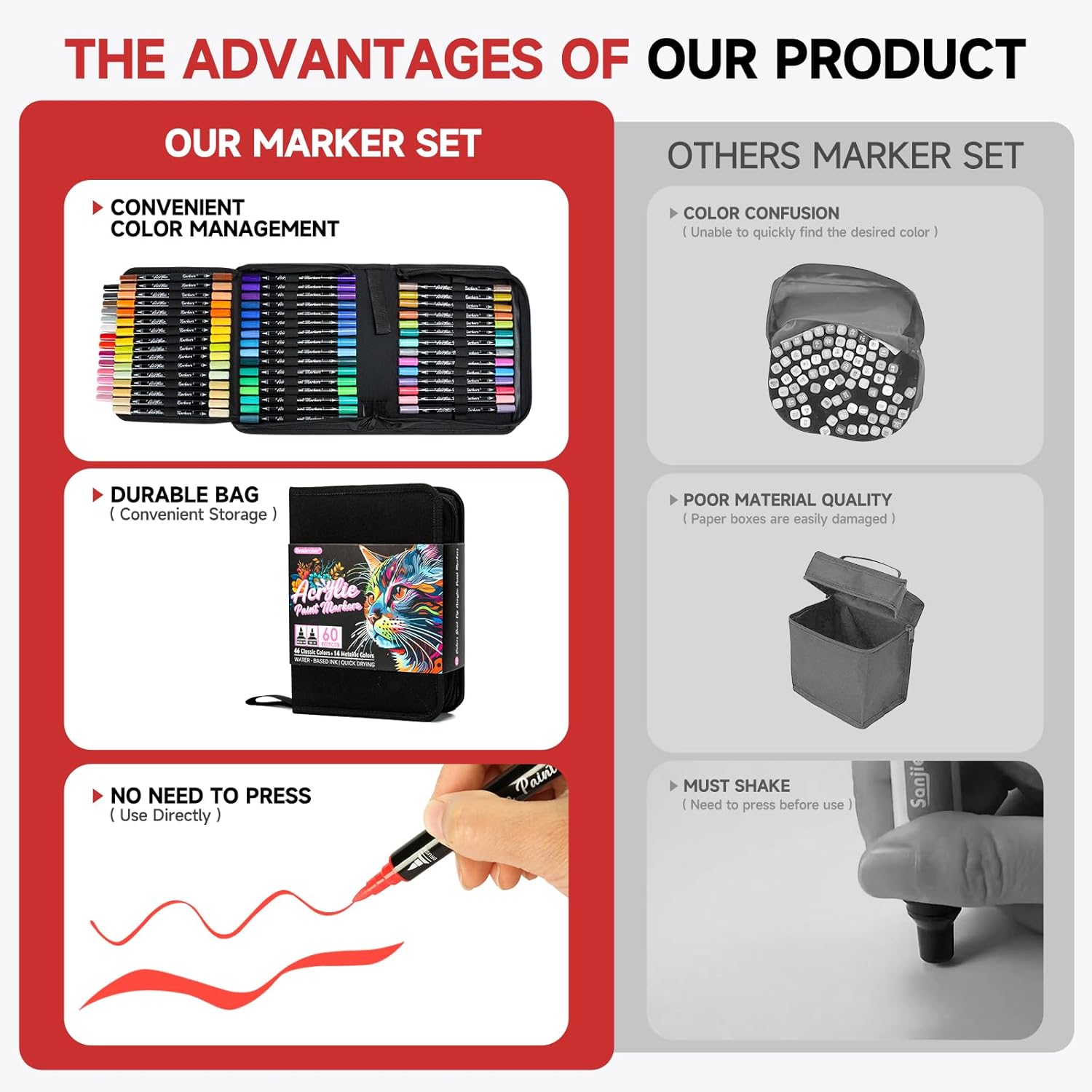 - 【Convenient Storage & Classification】Unlike traditional box sets, our acrylic paint markers come in a stylish carrying case with an organized layout. Each marker is securely stored in a separate compartment, making it easy to find the right color quickly. The lightweight, portable design makes it convenient to carry your markers wherever you go, perfect for artists, crafters, and DIY enthusiasts who love to create on the go