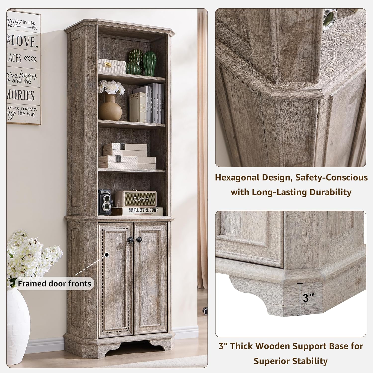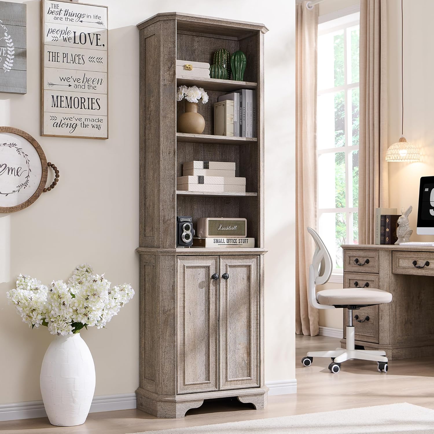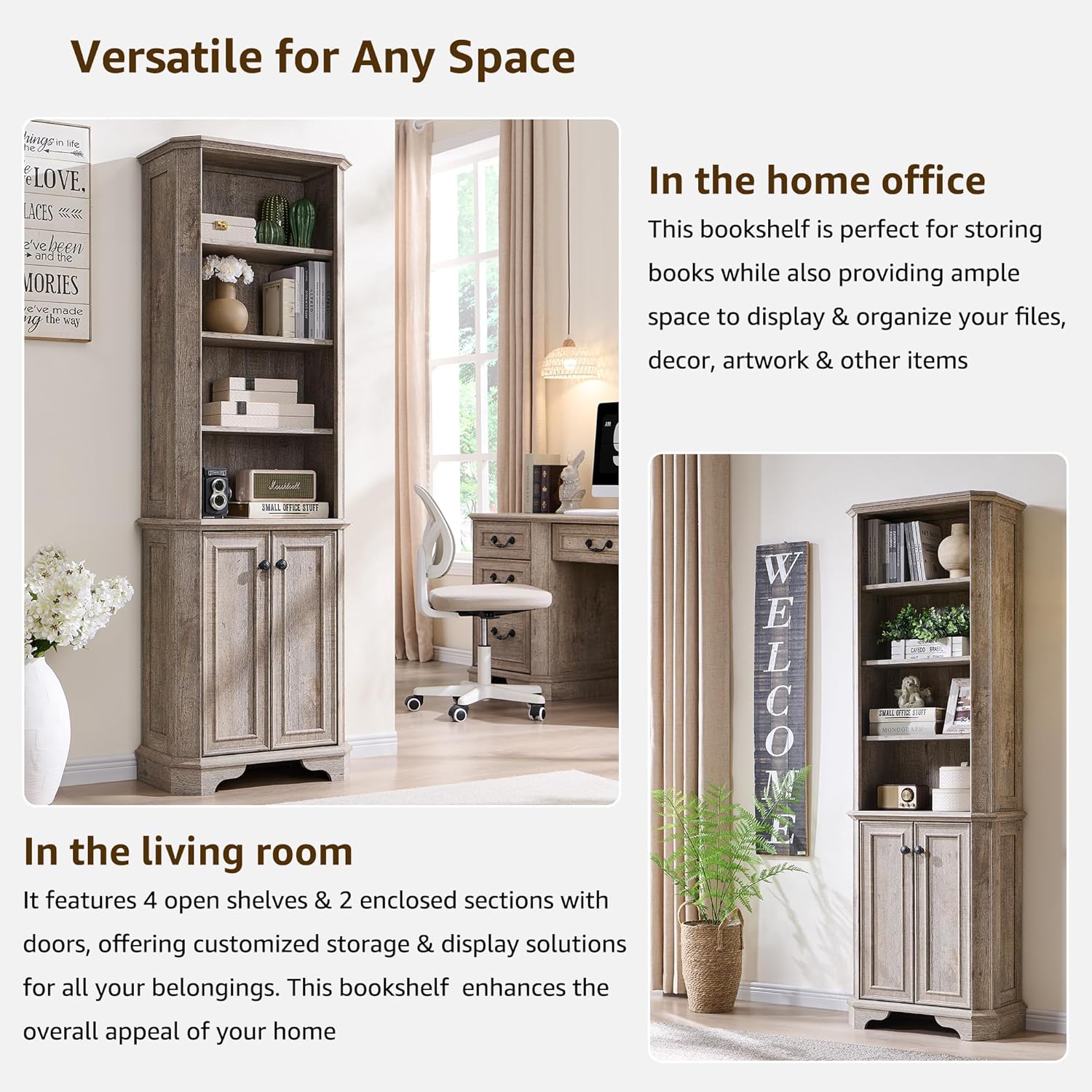 - Elegant & Sturdy 6-Tier Farmhouse Bookshelf with Farmhouse Charm: Upgrade your home office or living space with this 6-tier wood bookshelf, measuring 23.5âW x 11.7âD x 72âH. Designed to double as both a bookcase and a storage cabinet, it blends Victorian-style elegance with modern durability. The framed door fronts, hand-polished vintage mushroom knob, and a natural wood grain finish create a refined yet rustic aesthetic, enhancing any office or home dĂ©cor