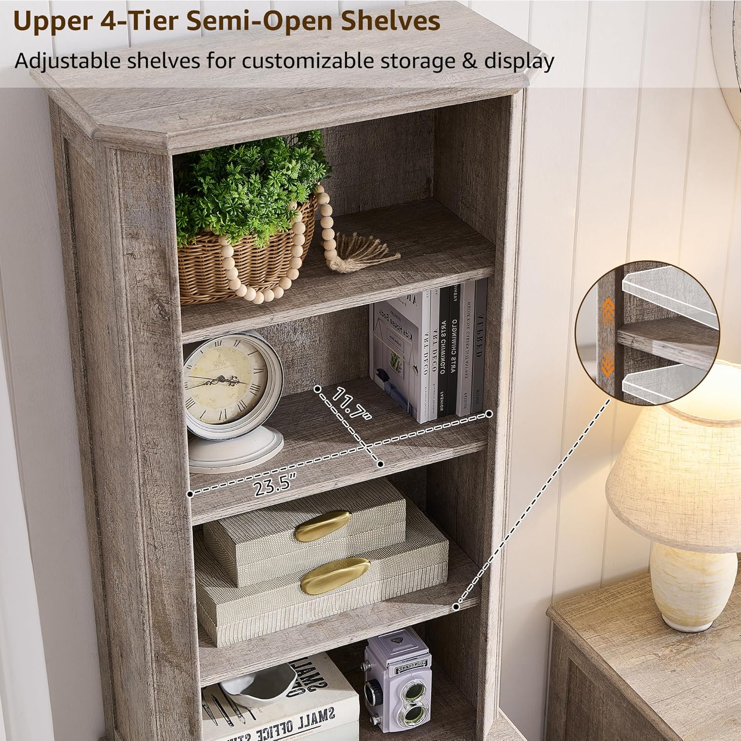 - 4 Adjustable Open Shelves:This wooden book shelf with door features four adjustable semi-open shelves, each with three height settings (up or down 2.5â), allowing you to customize shelf spacing between 7.2â-14.7â to fit books, trophies, decorative items, and frequently accessed items. bringing a touch of warmth and farmhouse style to your space