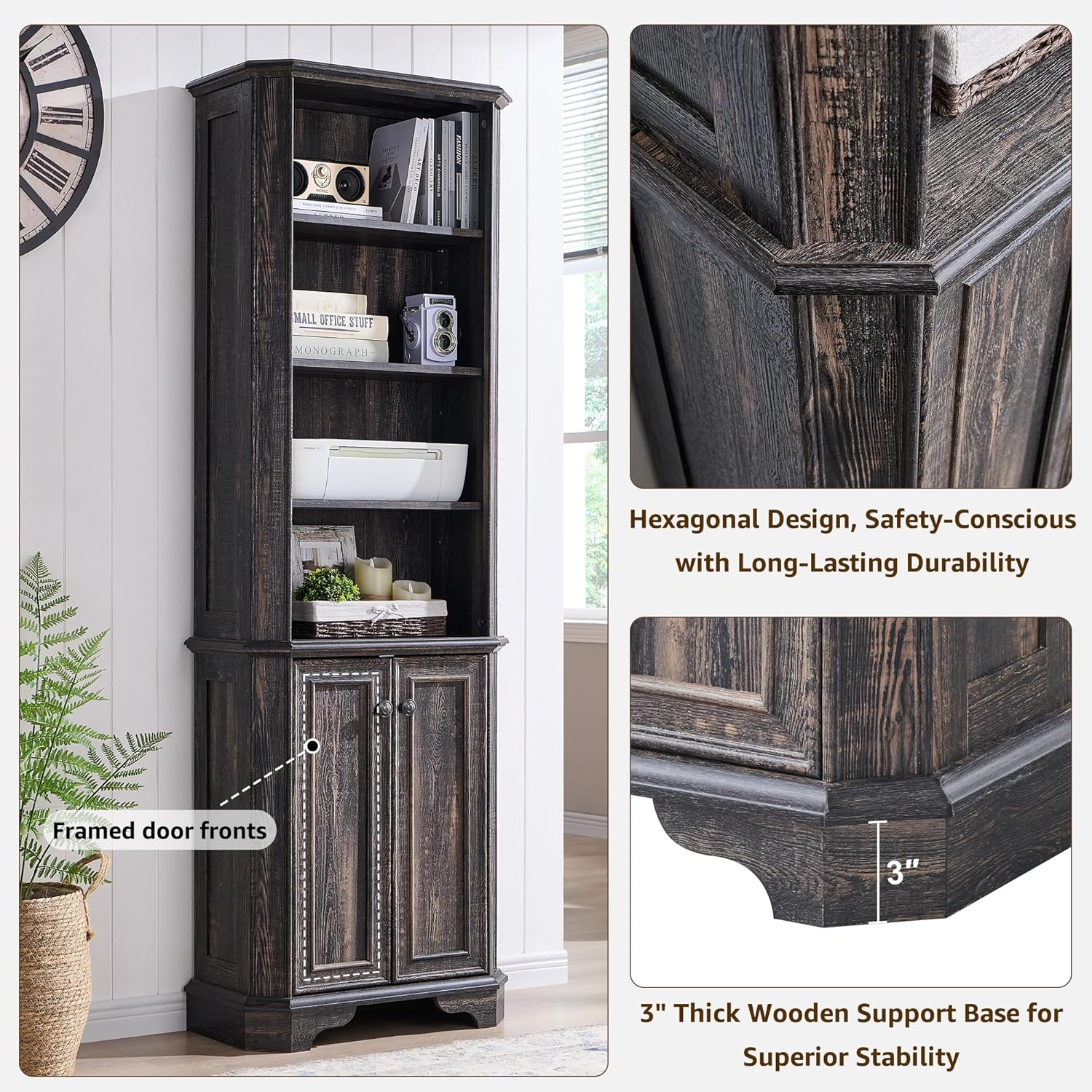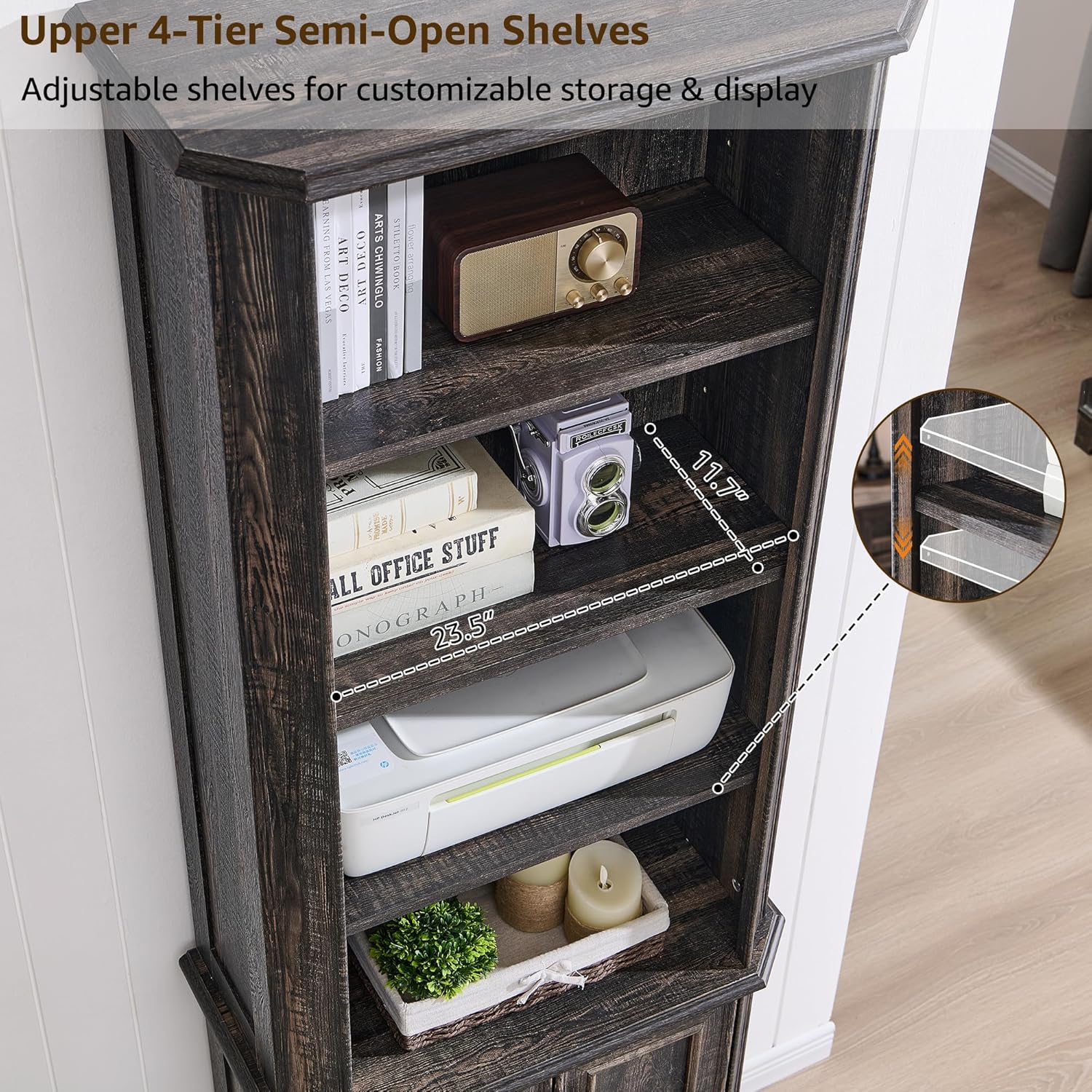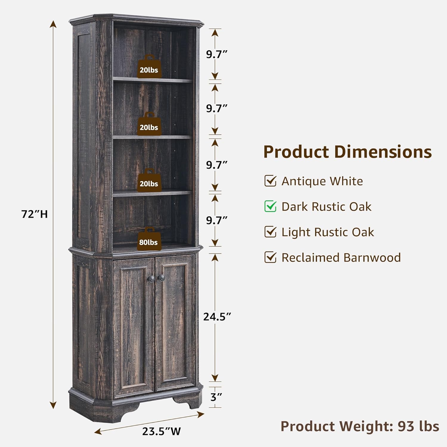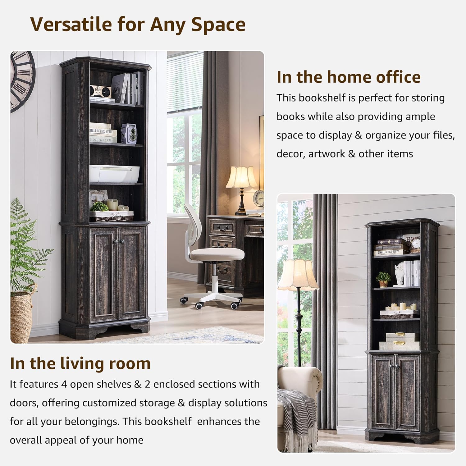 - Elegant & Sturdy 6-Tier Farmhouse Bookshelf with Farmhouse Charm: Upgrade your home office or living space with this 6-tier wood bookshelf, measuring 23.5âW x 11.7âD x 72âH. Designed to double as both a bookcase and a storage cabinet, it blends Victorian-style elegance with modern durability. The framed door fronts, hand-polished vintage mushroom knob, and a natural wood grain finish create a refined yet rustic aesthetic, enhancing any office or home dĂ©cor