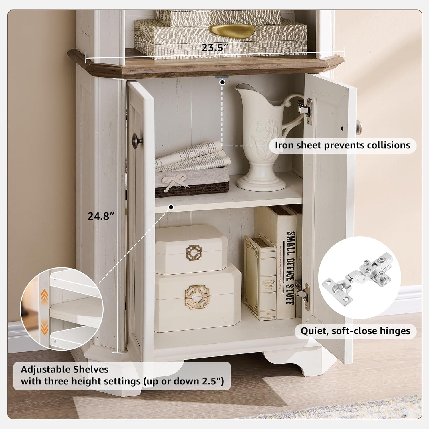 - Hidden Dual-Level Cabinets for Maximum Storage & Privacy: Discover a smart storage solution tucked behind elegant framed doors fronts. Two spacious tiers (23.5" W x 24.5" H) with three adjustable shelf settings let you tailor the space for your essentials. Enjoy whisperâquiet softâclose hinges that provide a serene, libraryâlike experienceâkeeping your items secure and your space clutterâfree