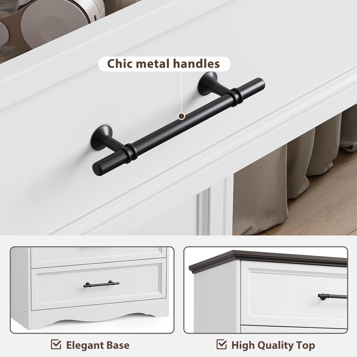 White Farmhouse Dresser for Bedroom, 36" Tall 4 Drawer Chest with Sleek Brushed Metal Handles, Modern Wood Storage Cabinet with Unique Base Design, Closet Organizer for Bedroom, Living Room, Hallway