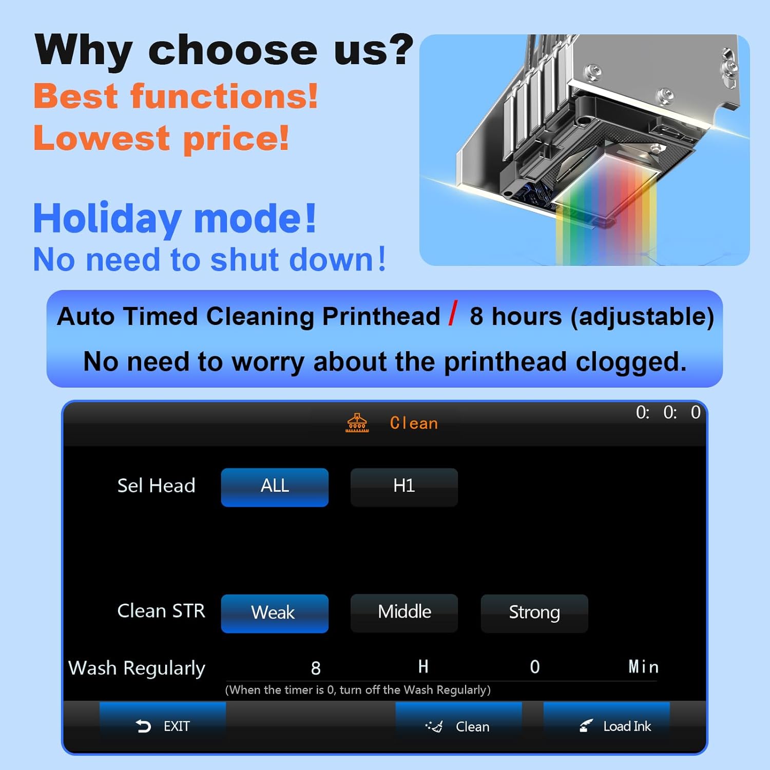 - ❤️❤️❤️Holiday Mode :The First automatic printhead timing cleaning system(free to adjust the timing),Say goodbye to print head blockages! ❤️❤️❤️Two Year Ink Supply : With your printer purchase, you’ll receive a two-year supply of ink— 5 bottles (250ml each) and 500g of powder! Get a new set every two months, and you only need to cover the shipping,Only within the US.