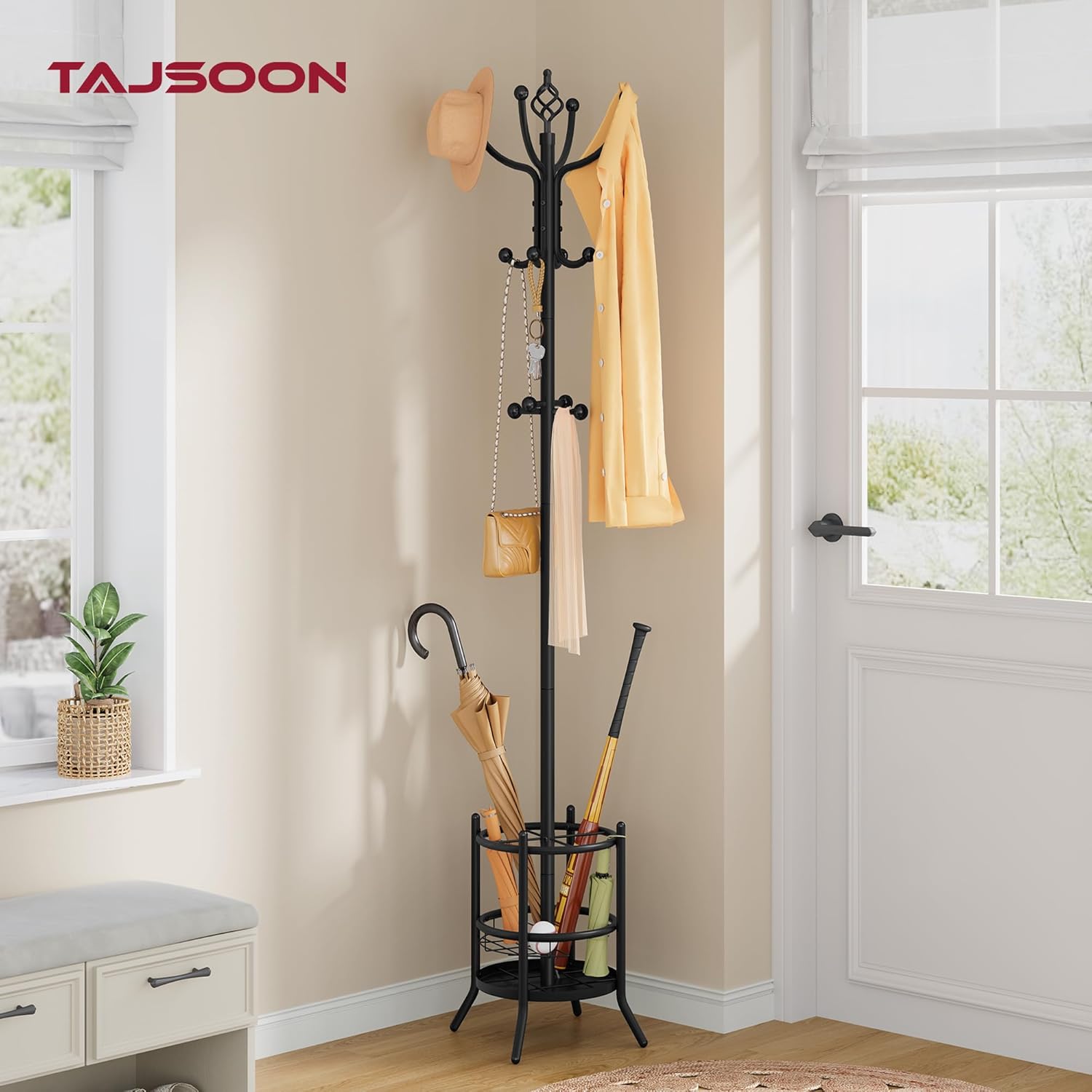 Tajsoon Coat Rack Stand with Umbrella Holder, Coat Tree Freestanding with 16 Hooks, Coat Hangers Stand for Living Room, Bedroom, Office, Black