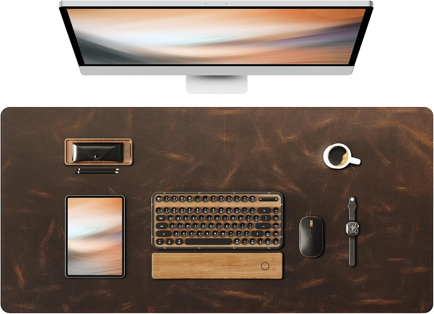 YSAGi Leather Desk Mat, 35.4"x17"Real Leather Desk Pad,3mm Thick Desk Blotter with Stiched line,Oil-Wax Feel Mouse pad and Self-Healing Laptop Pad for Home & Office(Classic Dark Brown)
