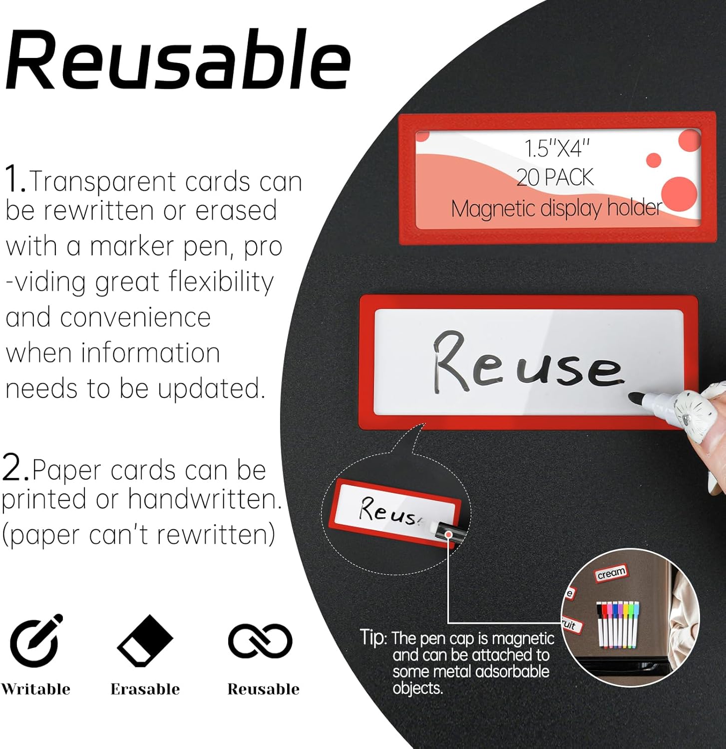 20Pcs Magnetic Plastic Label Holder 1.5x4 inch for Supermarket Store Price Tag Metal Shelf File Storage Cabinet Drawer Label Tag Resuable with 8 Color Chalk Makers, 20Pcs White Paper (Red)