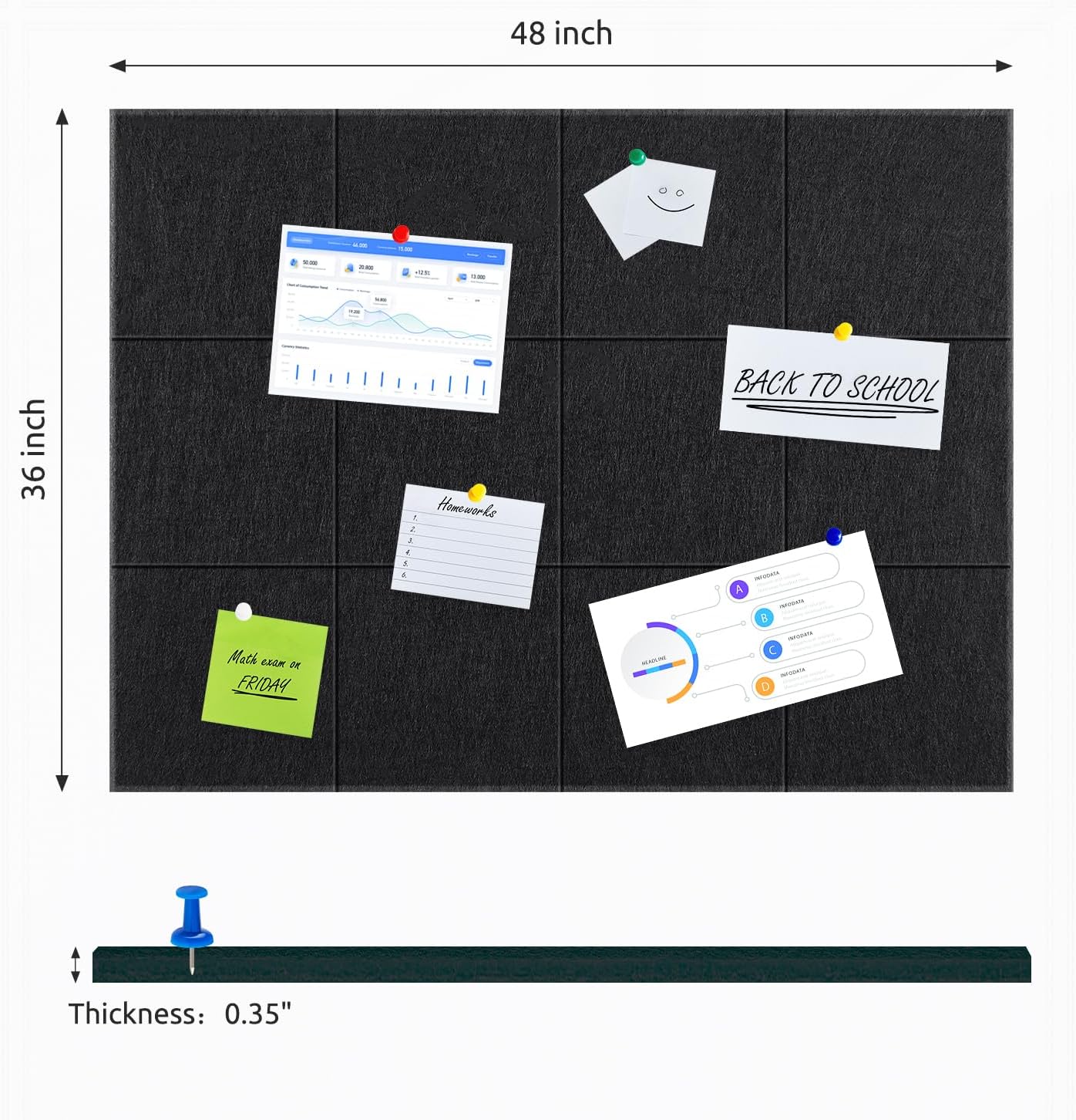 Cork Board for Wall,48"x36" 12 Pack Felt Wall Tiles with Safe Removable Adhesive Tabs, Bulletin Boards for Home Office Kitchen, Pin Board Notice Board for Photos, Memos, Black