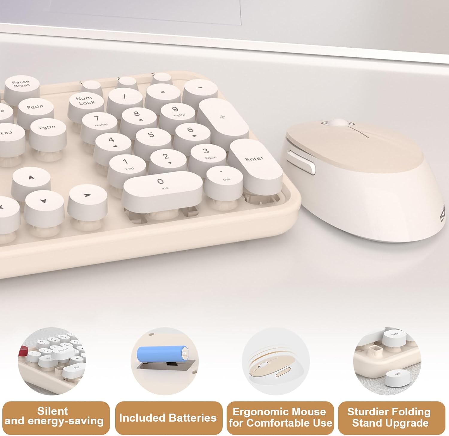 Wireless Keyboard and Mouse Combo, MOFII 104 Keys Full-Size Retro Round Keys Typewriter Keyboards Ergonomic Keyboards and Mouse Wireless for Windows, PC, Laptop, Desktop White