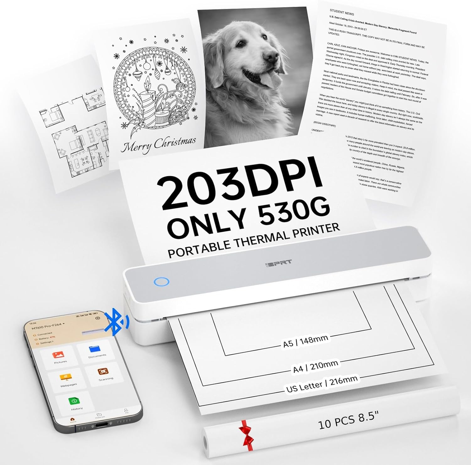 iDPRT Portable Thermal Printer,203DPI Wireless Bluetooth Small Printers for Travel,Office,Vehicles,Support 8.5" x 11" US Letter&A4 A5 Size, Compatible with Smartphone & Laptop