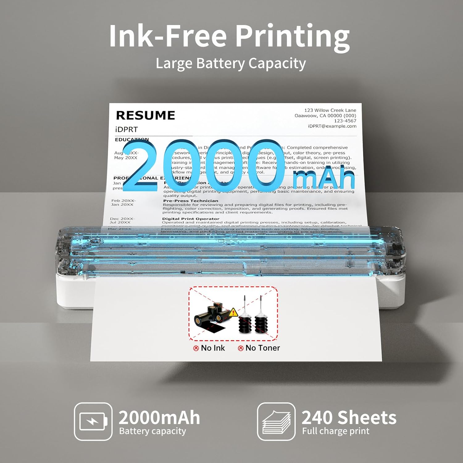 - Long-Lasting Battery: This compact printer features a built-in 2000mAh rechargeable battery, capable of printing up to 240 sheets (approx. 4 hours of continuous use). The small printer for professionals - print contracts, documents and files effortlessly at home, office or in a vehicle