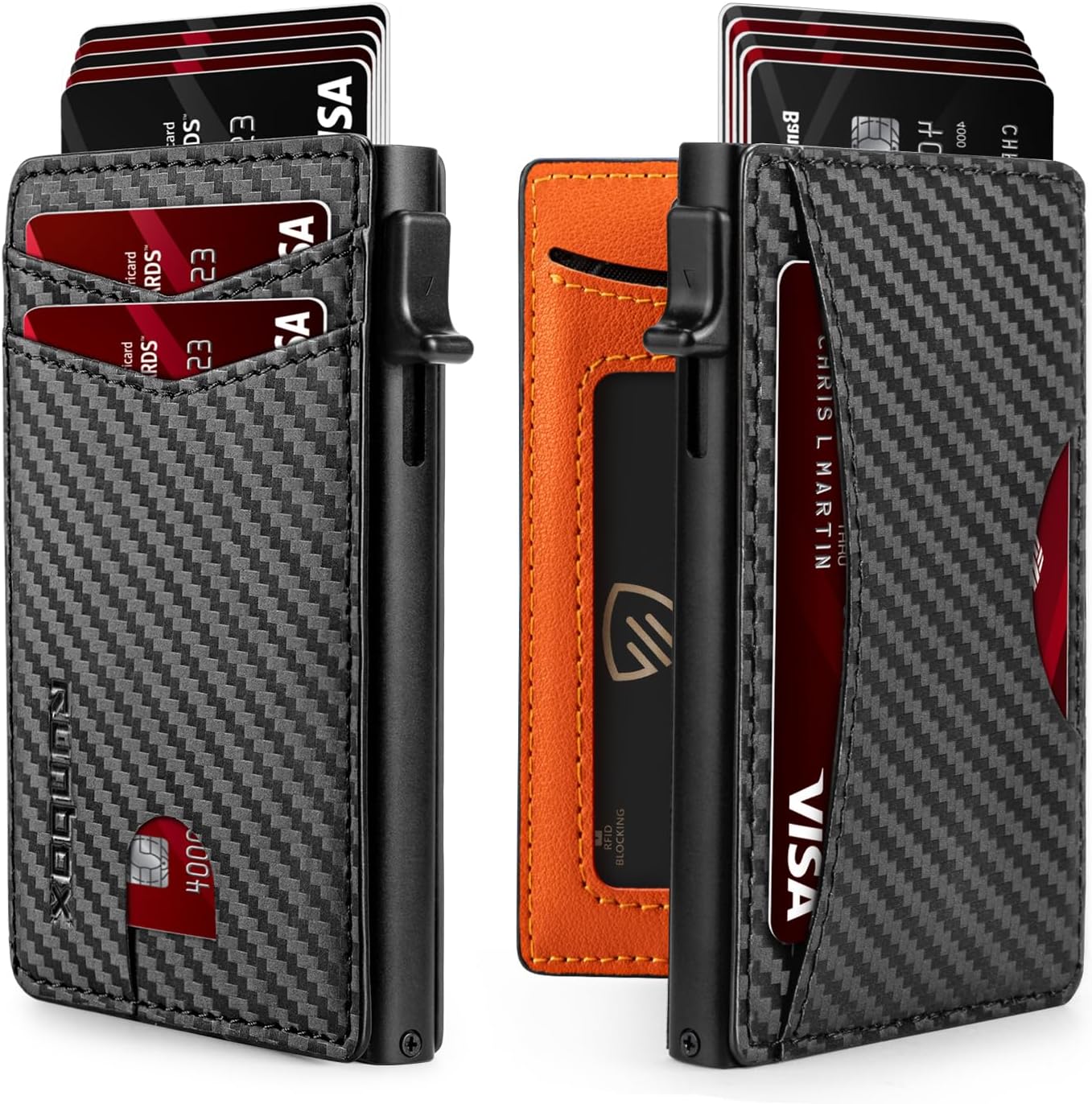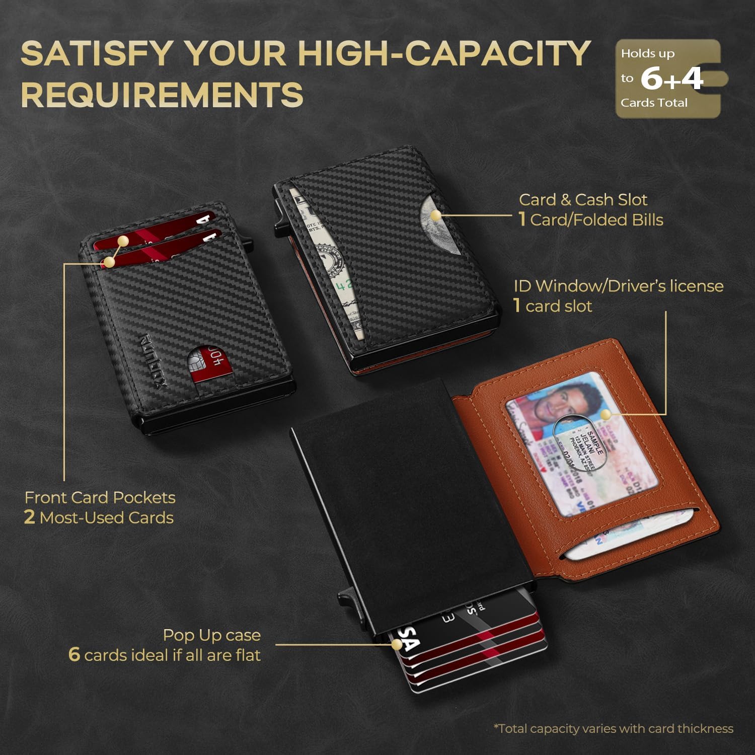 - QUICKEST ACCESS: Get instant card access with just one hand by tapping a button. The front pocket holds your 2 most-used cards, while the pop-up aluminum card holder stores 1-7 cards (The actual capacity depends on the card thickness ) . Features an ID window for your driver's license and a back pocket that fits one card or cash