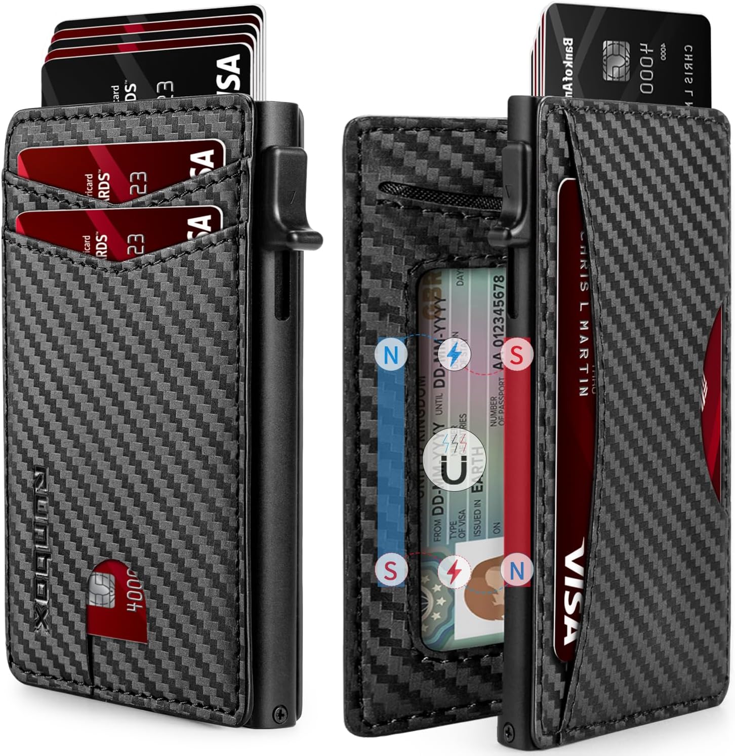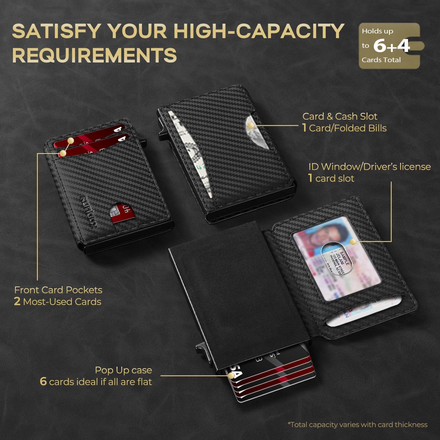 - QUICKEST ACCESS: Get instant card access with just one hand by tapping a button. The front pocket holds your 2 most-used cards, while the pop-up aluminum card holder stores 1-6 cards (The actual capacity depends on the card thickness ) . Features an ID window for your driver's license and a back pocket that fits one card or cash