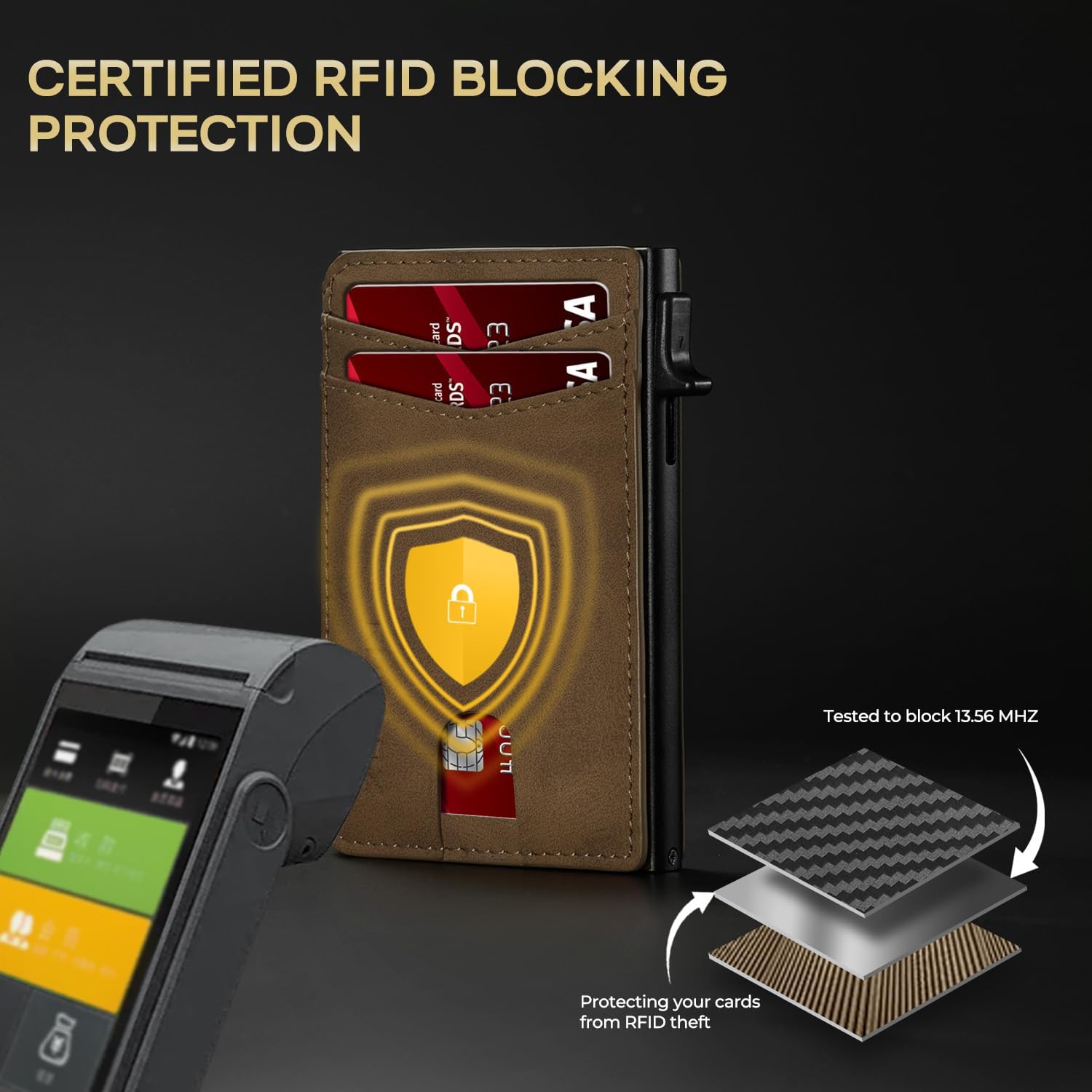 - Military-Grade RFID/NFC Protection: Built with solid aluminum shielding, this smart wallet blocks 13.56MHz signals to prevent digital theft. Safeguard credit cards and IDs from skimming devices – your data stays secure