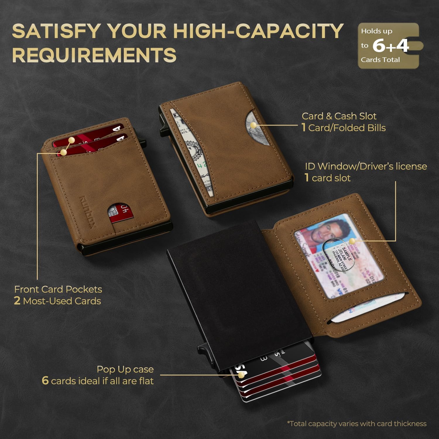 - QUICKEST ACCESS: Get instant card access with just one hand by tapping a button. The front pocket holds your 2 most-used cards, while the pop-up aluminum card holder stores 1-7 cards (The actual capacity depends on the card thickness ) . Features an ID window for your driver's license and a back pocket that fits one card or cash