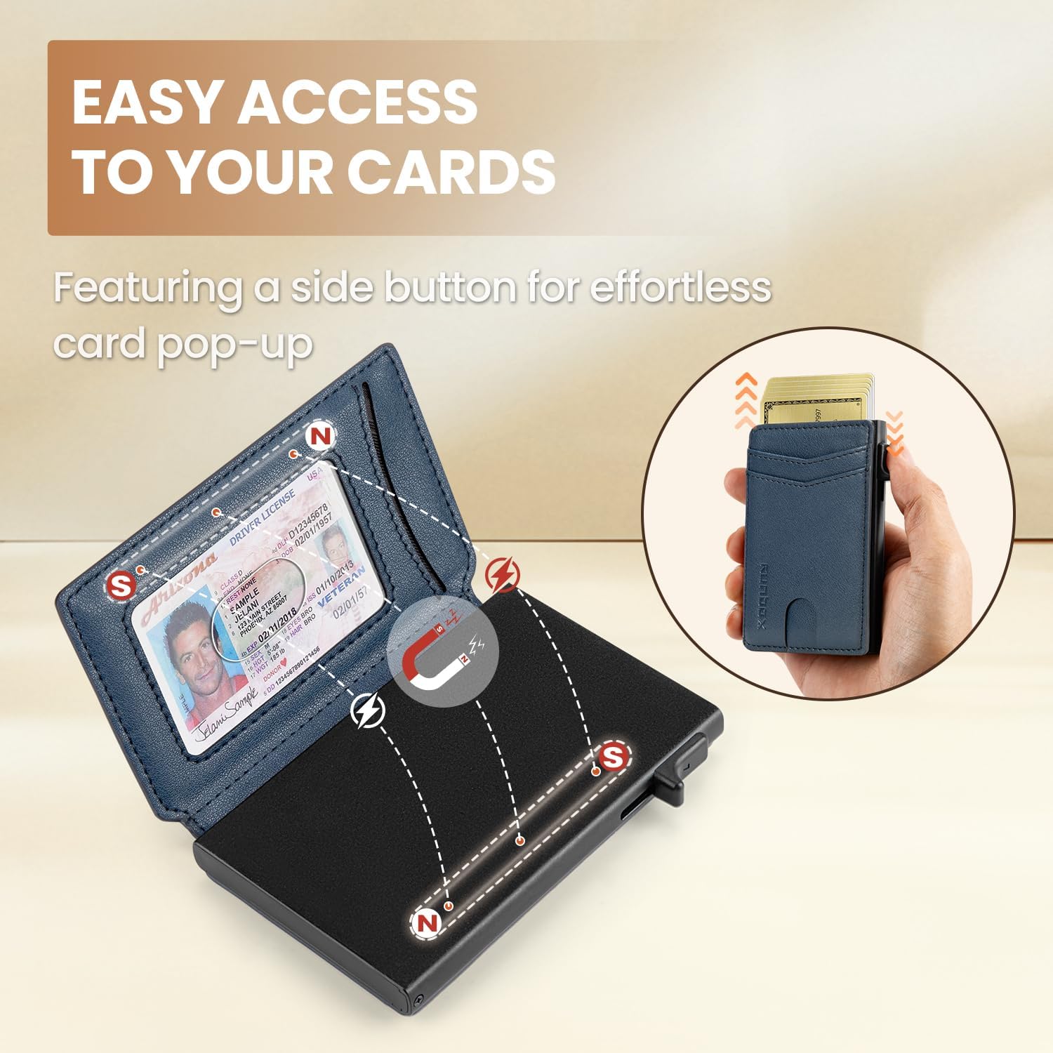 - QUICKEST ACCESS: Get instant card access with just one hand by tapping a button. The front pocket holds your 2 most-used cards, while the pop-up aluminum card holder stores 1-7 cards (The actual capacity depends on the card thickness ) . Features an ID window for your driver's license and a back pocket that fits one card or cash