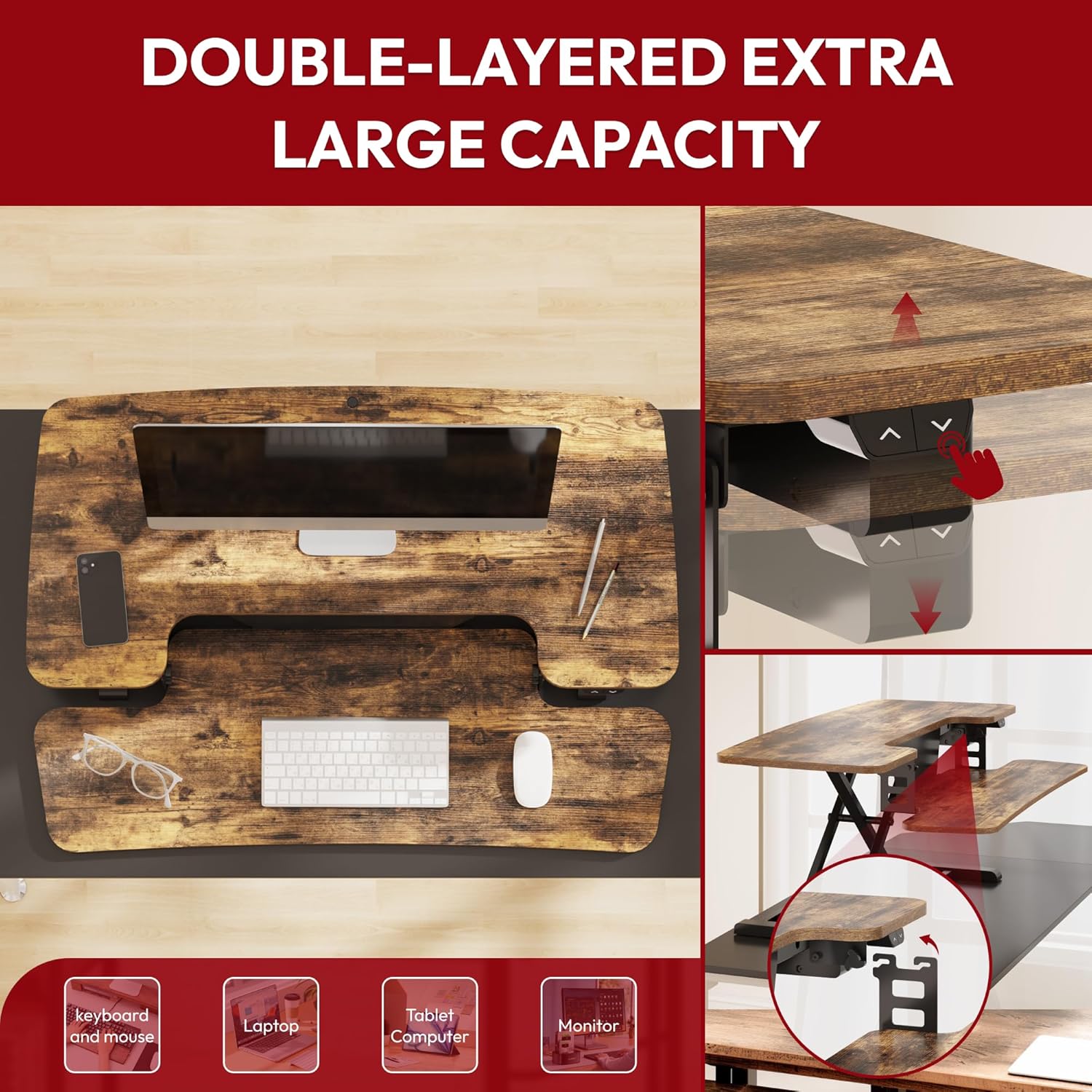 SANODESK Standing Desk Converter with Electric Motor 42" Height Adjustable Riser for Office Home,Dual Monitor and Laptop Workstation with Large Keyboard Tray,Rustic Color