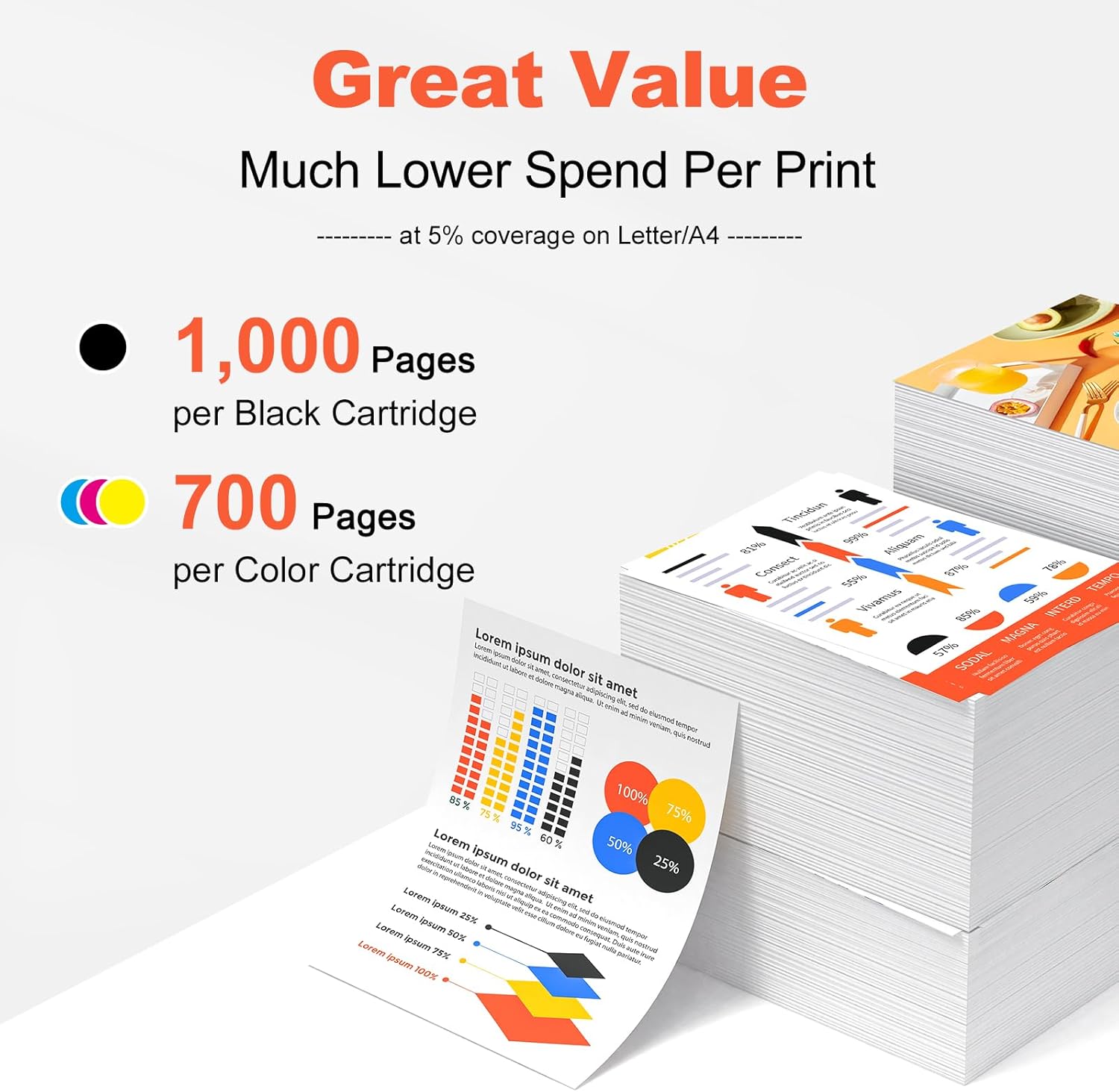 - Print more and cost less: 1,000 Pages per Black cartridge, 700 Pages per Cyan/Yellow/Magenta Cartridge at 5% coverage (Letter/A4)