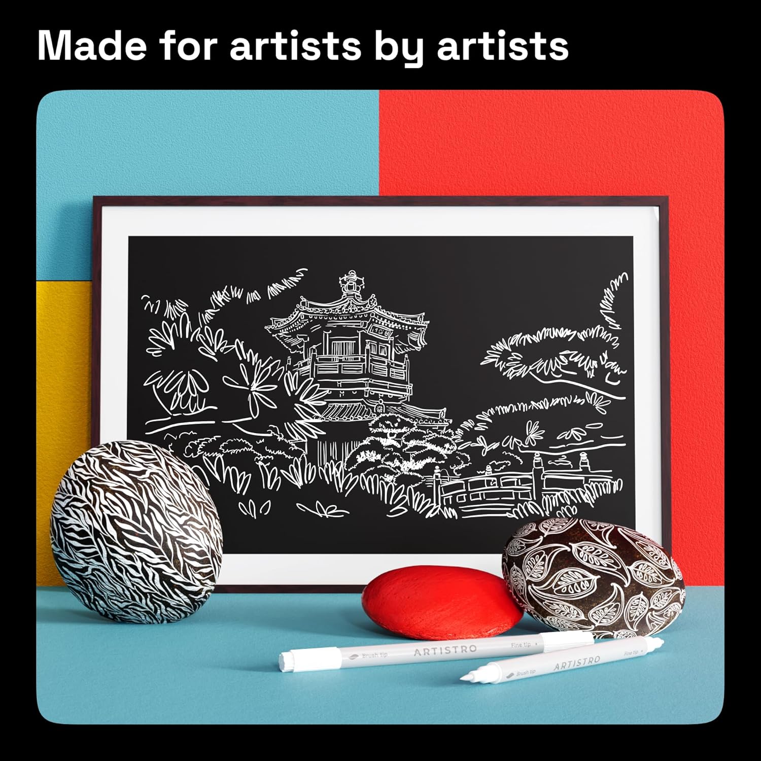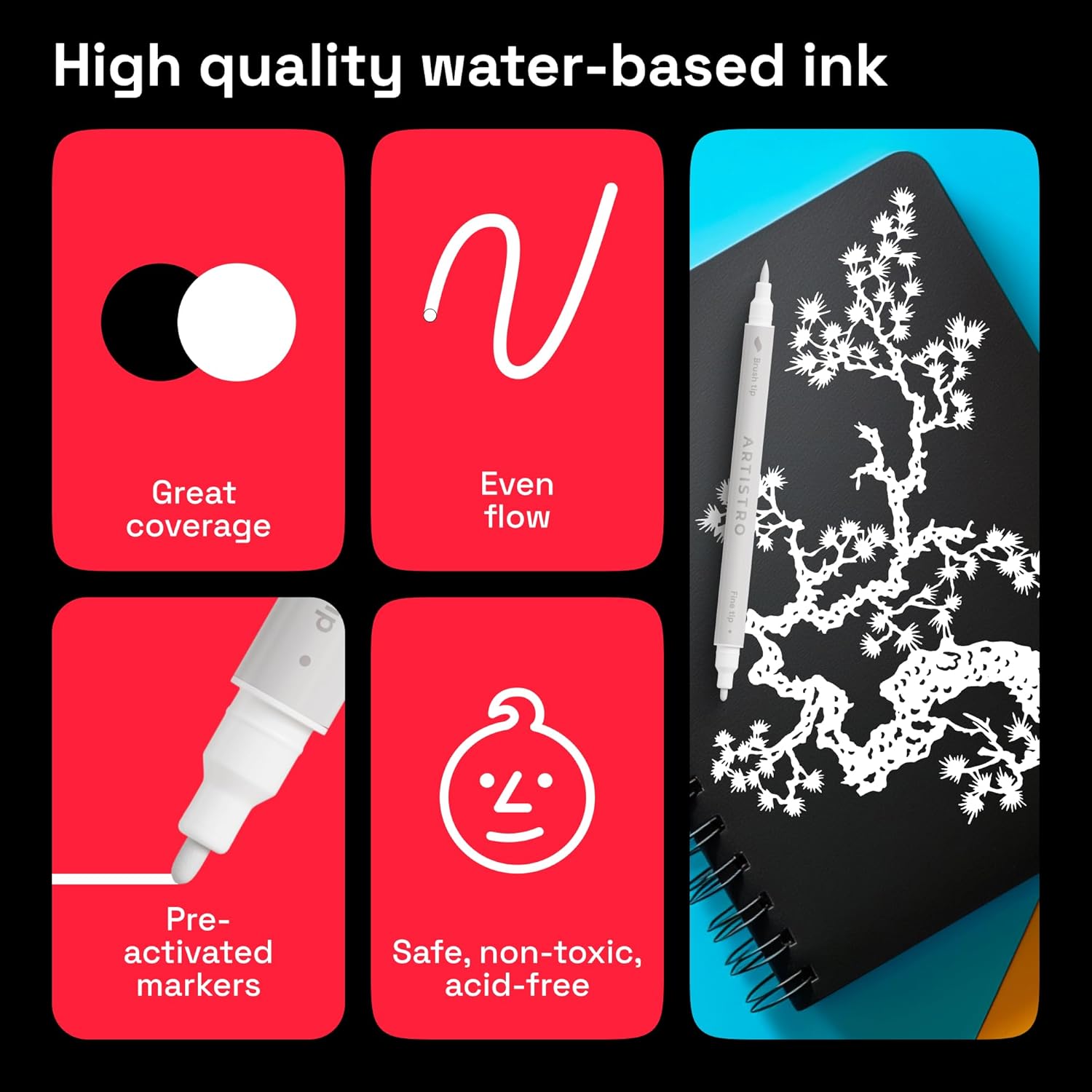 ARTISTRO 2 White Dual-Tip Acrylic Paint Pens - Multisurface Markers for Fabric, Plastic, & More, 1 mm Fine & Brush Tips