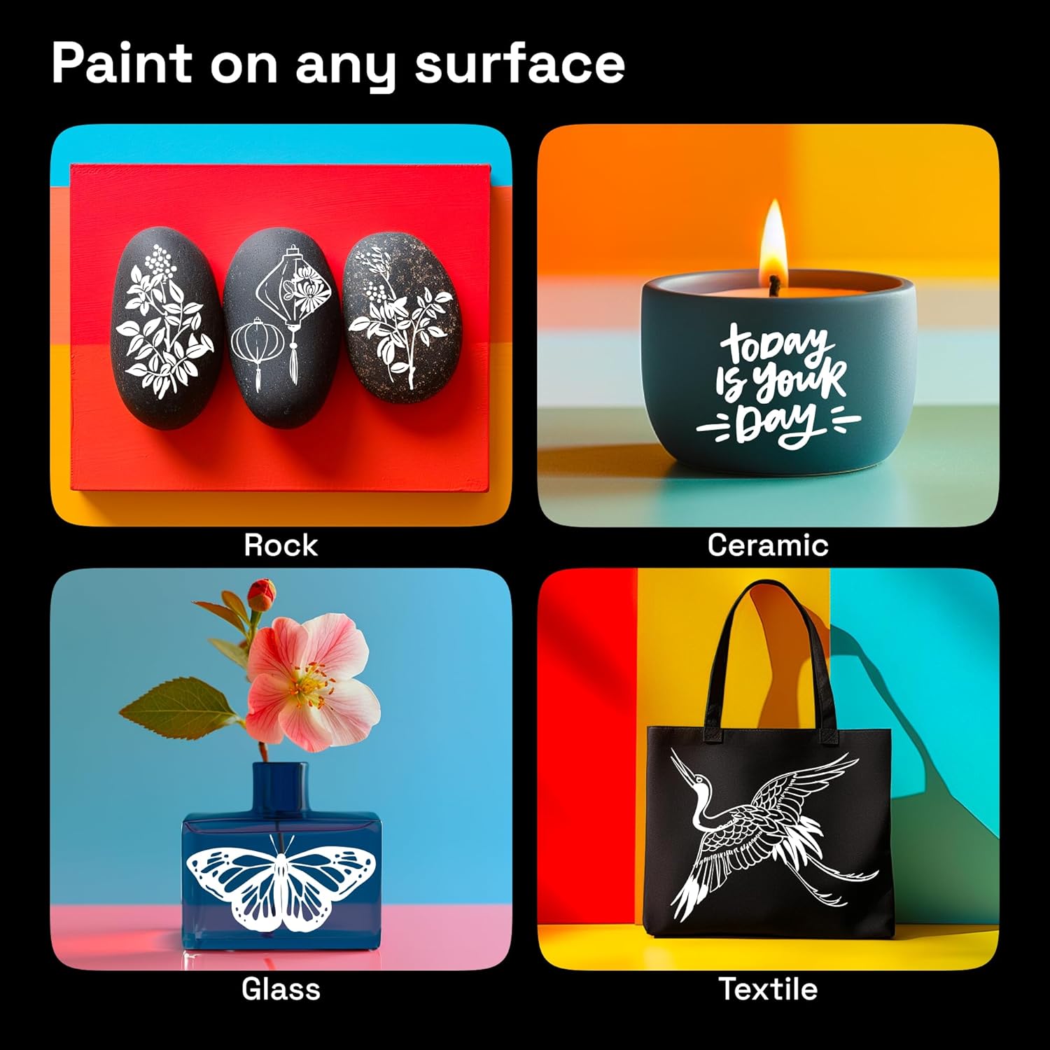 - PREMIUM QUALITY: This white pack of paint pens features high-quality acrylic paint that dries opaque, so you don’t have to make a second layer! The ink in the paint markers for canvas is water-based and features a durable nib.