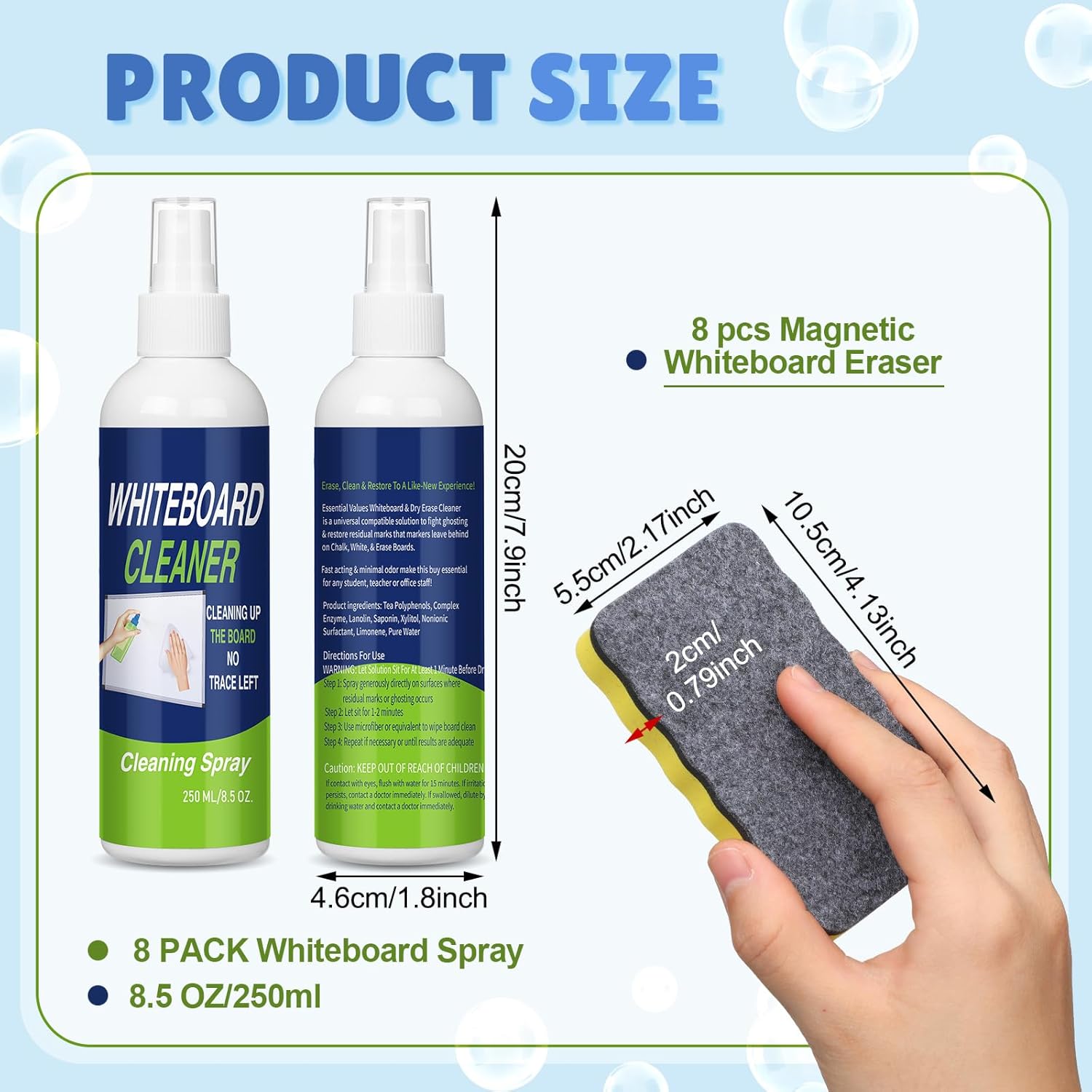 - Safe and Effective Materials: the 8 pieces 8.5 fl oz whiteboard cleaner and 8 colorful magnetic whiteboard erasers kit features safe materials, ensuring a non toxic experience; This dry erase cleaner and eraser kit offers an friendly solution for maintaining your white board's cleanliness, ideal for classrooms and offices