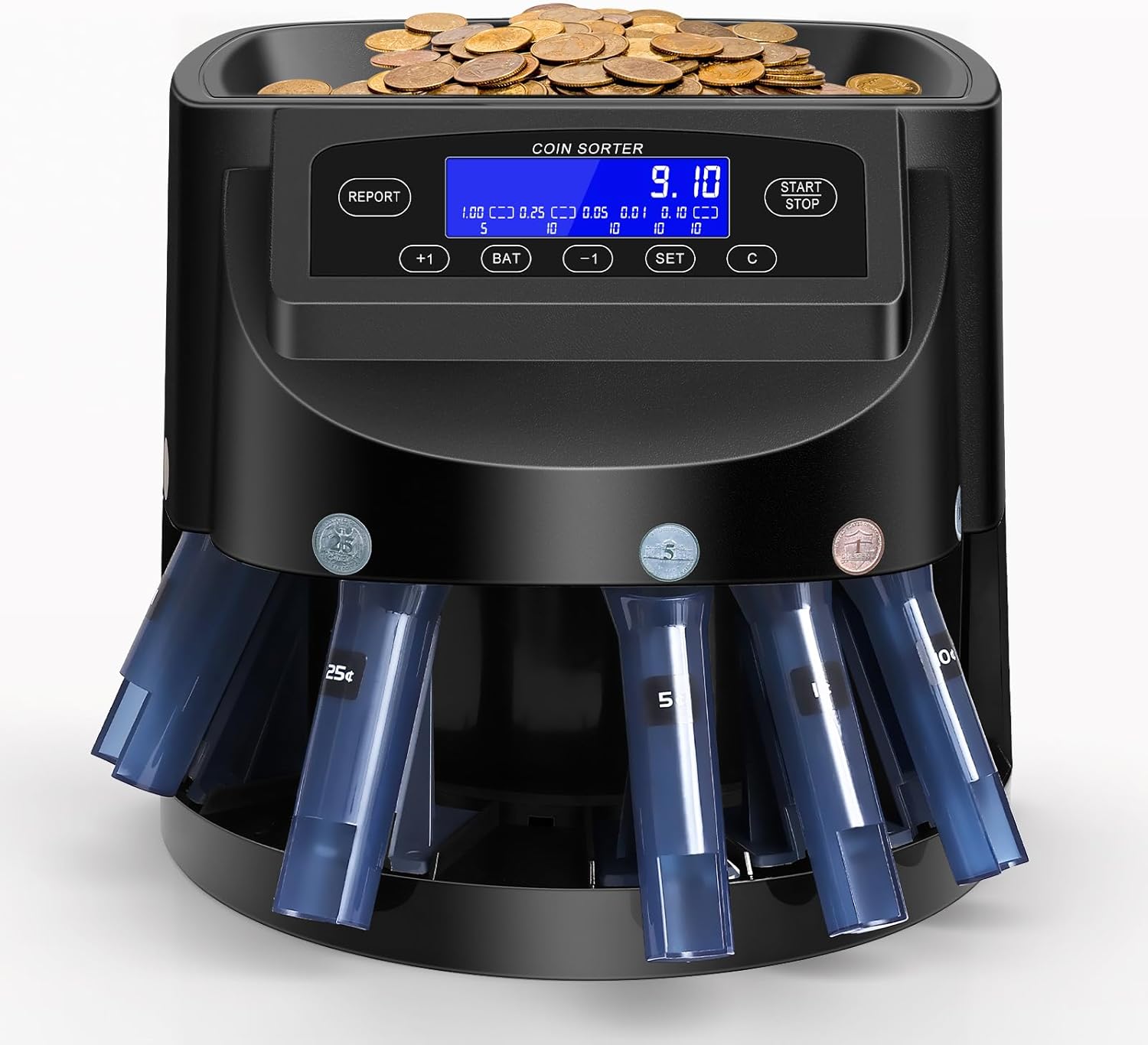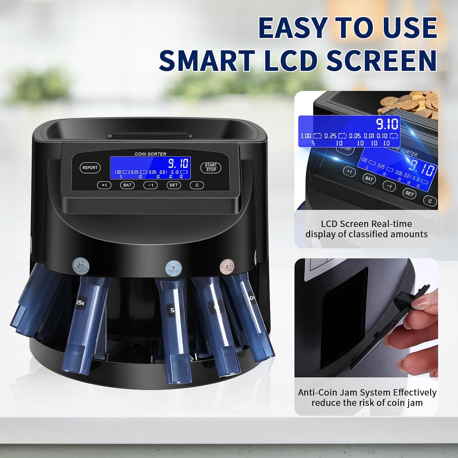 - MULTI-PURPOSE: The coin sorter contains a coin tube attachment that can automatically fill pre-made coin wrappers. When the roll is full, the machine will automatically stop, providing great convenience for bank deposits or change exchange. The change counter is equipped with an intelligent anti-stuck coin system that can automatically detect and adjust the coin path, effectively reducing the risk of coin jams and ensuring smooth operation, making your change management smoother.