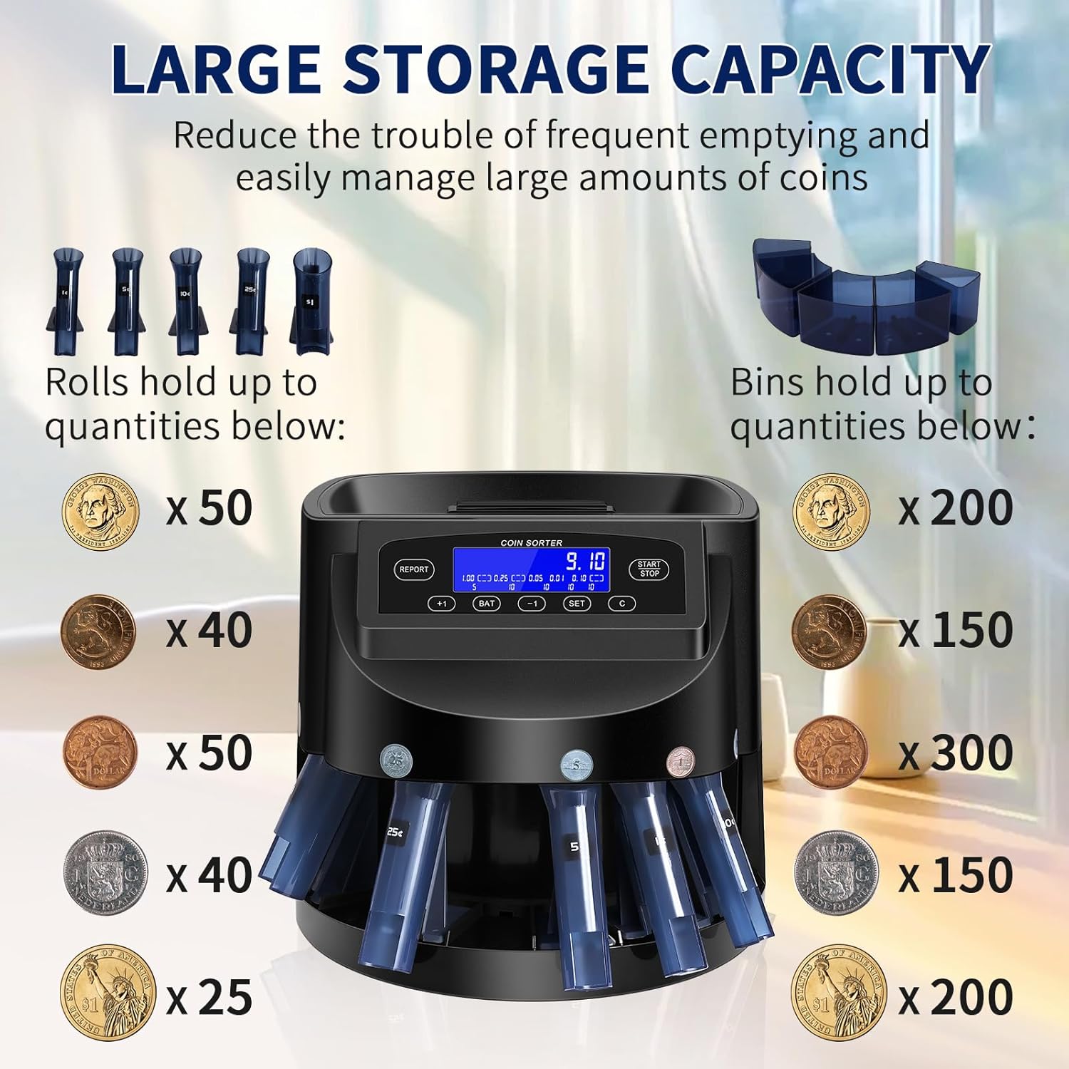 - EFFICIENT AND FAST: The coin counter adopts the latest upgraded coin sorting technology, which can process up to 270 coins per minute, which is 10% more efficient than traditional models. The coin sorter and wrapper machine is equipped with a large-capacity coin hopper that can hold up to 300 coins, reducing the trouble of frequent emptying, ensuring long-term efficient operation, allowing you to save time and effort and easily manage large quantities of coins.