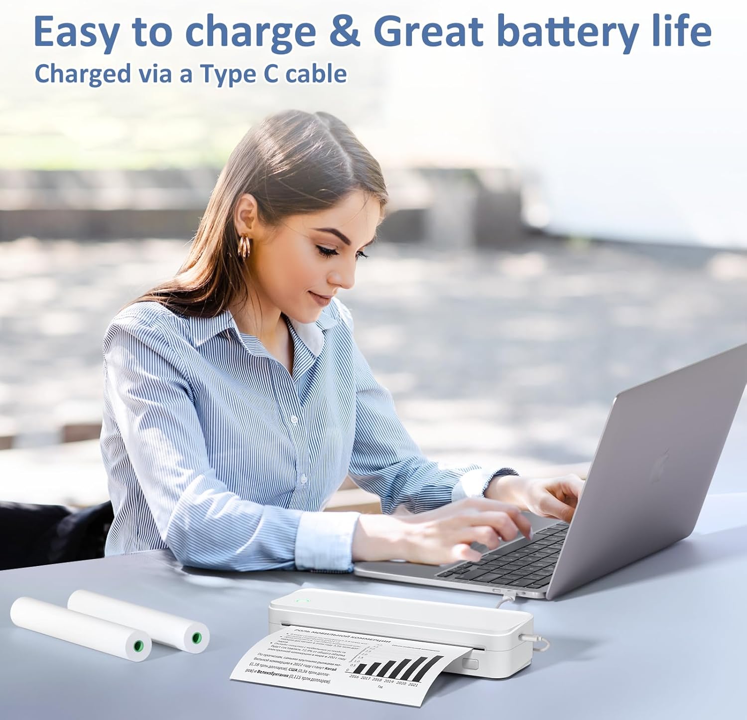 Inkless Portable Printer for Travel, Wireless Thermal Printer Supports 8.5 x 11 Inch US Letter Size, Bluetooth Machine Includes Carry Case and 3 Rolls of Thermal Paper Kit, White