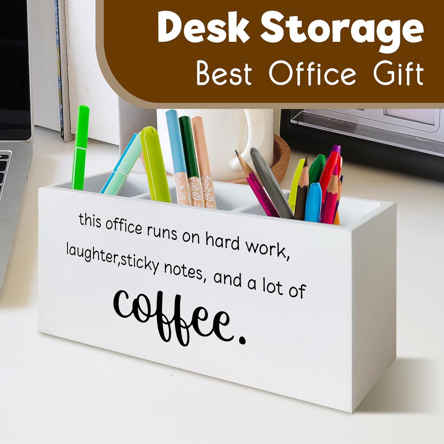 Funny Office Gifts Pen Holder for Desk, Work Humor Gifts for Coworkers Coffee Lovers, This Office Runs on Hard Work Wooden Pen Pencil Holder Organizer for Desk Accessories
